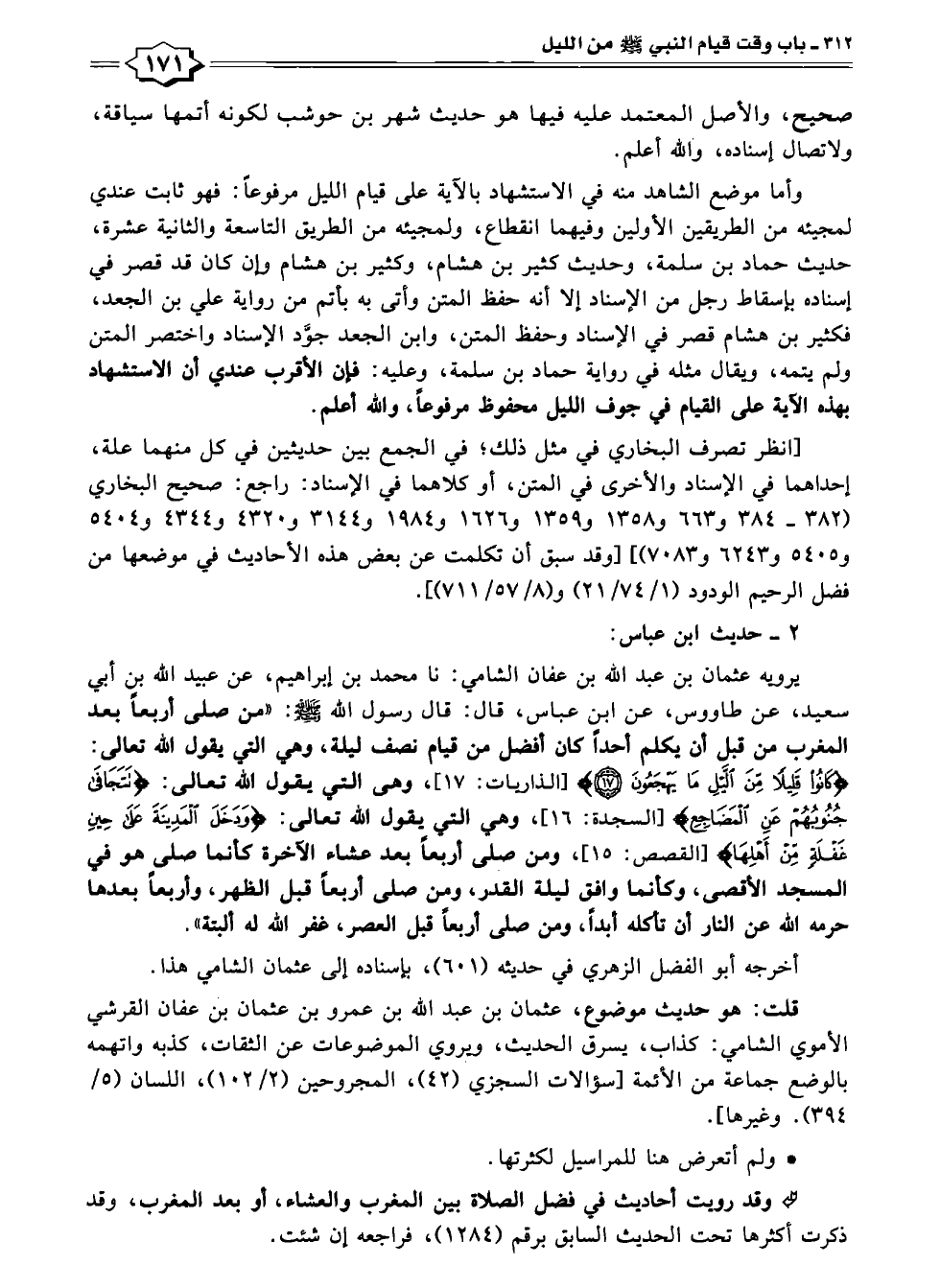 يرويه عثمان بن عبد الله بن عفان الشامي: نا محمد بن إبراهيم، عن عبيد الله بن أبي سعيد، عن طاووس، عن ابن عباس، قال: قال رسول الله - صلى الله عليه وسلم -: "من صلى أربعًا بعد المغرب من قبلِ أن يكلم أحدًا كان أفضل من قيام نصف ليلة، وهي التي يقول الله تعالى: {كَانُوا قَلِيلًا مِنَ اللَّيْلِ مَا يَهْجَعُونَ (١٧)} [الذاريات: ١٧]، وهى التي يقول الله تعالى: {تَتَجَافَى جُنُوبُهُمْ عَنِ الْمَضَاجِعِ} [السجدة: ١٦]، وهي التي يقول الله تعالى: {وَدَخَلَ الْمَدِينَةَ عَلَى حِينِ غَفْلَةٍ مِنْ أَهْلِهَا} [القصص: ١٥]، ومن صلى أربعًا بعد عشاء الآخرة كأنما صلى هو في المسجد الأقصى، وكأنما وافق ليلة القدر، ومن صلى أربعًا قبل الظهر، وأربعاً بعدها حرمه الله عن النار أن تأكله أبدًا، ومن صلى أربعًا قبل العصر، غفر الله له ألبتة".