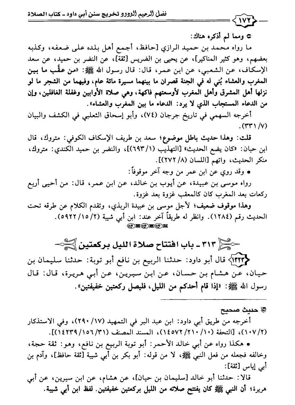 ١٣٢٣ قال أبو داود: حدثنا الربيع بن نافع أبو توبة: حدثنا سليمان بن حيان، عن هشام بن حسان، عن ابن سيرين، عن أبي هريرة، قال: قال رسول الله - صلى الله عليه وسلم -: "إذا قام أحدكم من الليل، فليصل ركعتين خفيفتين".