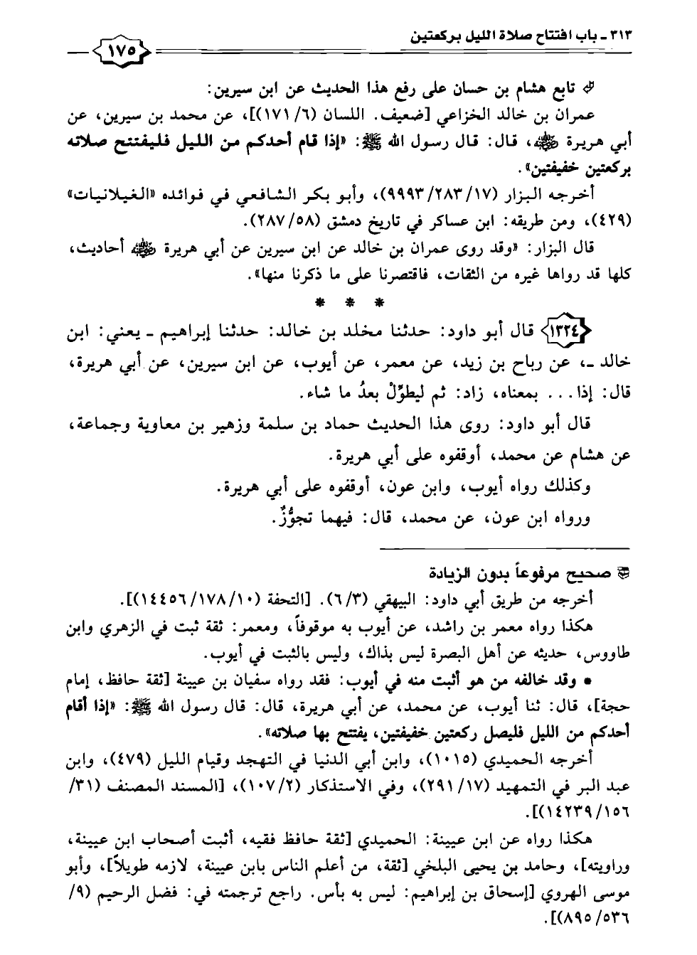 • وقد خالفه من هو أثبت منه في أيوب: فقد رواه سفيان بن عيينة [ثقة حافظ، إمام حجة]، قال: ثنا أيوب، عن محمد، عن أبي هريرة، قال: قال رسول الله - صلى الله عليه وسلم -: "إذا أقام أحدكم من الليل فليصل ركعتين خفيفتين، يفتتح بها صلاته".