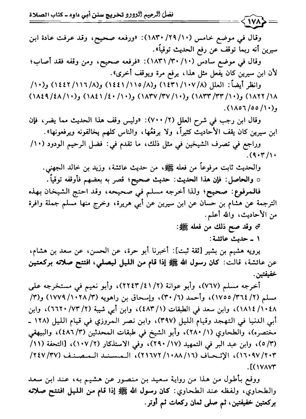 أخرجه مسلم (٧٦٧)، وأبو عوانة (٢/ ٤١/ ٢٢٤٣)، وأبو نعيم في مستخرجه على مسلم (٢/ ٣٦٤/ ١٧٥٥)، وأحمد (٦/ ٣٠)، وإسحاق بن راهويه (٣/ ١٠٢٨/ ١٧٧٩) و (٣/ ١٠٤٨/ ١٨١٤)، وابن سعد في الطبقات (١/ ٤٨٣)، وابن أبي شيبة (٢/ ٧٣ /٦٦٢٠)، وابن أبي الدنيا في التهجد وقيام الليل (٣٩٧)، وابن نصر المروزي في قيام الليل (١٢٨ - مختصره)، والطحاوي (١/ ٢٨٠)، وأبو الشيخ في طبقات المحدثين (٣/ ٤٨٦)، والبيهقي (٣/ ٥)، وابن عبد البر في التمهيد (١٧/ ٢٩٠)، وفي الاستذكار (٢/ ١٠٧)، [التحفة (١١/ ٢٠٣/ ١٦٠٩٧)، الإتحاف (١٦/ ١٠٨٨/ ٢١٦٧٢)، المسند المصنف (٣٧/ ٢٤٧/ ١٧٨٧٣)].