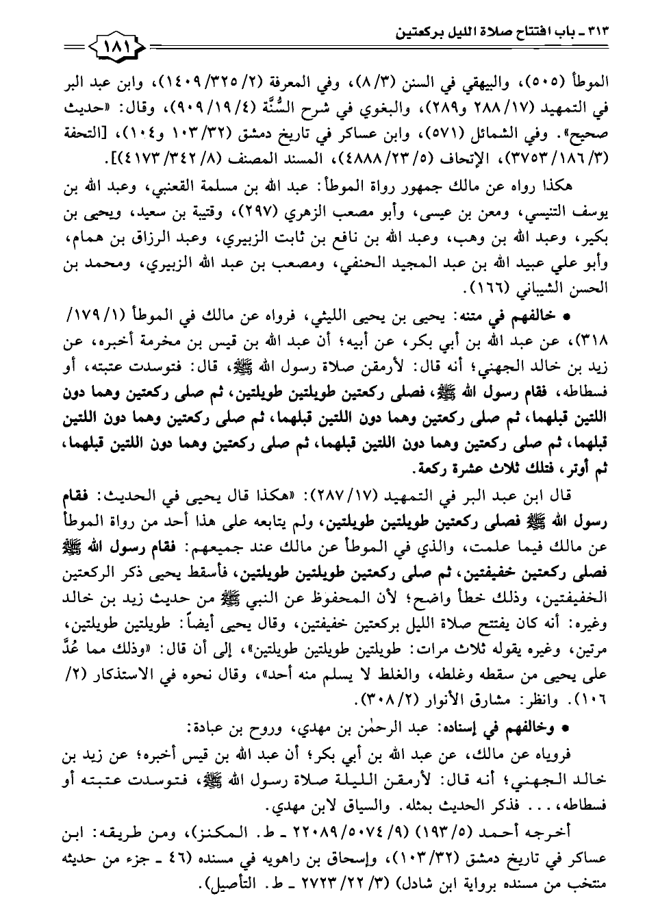 قال ابن عبد البر في التمهيد (١٧/ ٢٨٧): "هكذا قال يحيى في الحديث: فقام رسول الله - صلى الله عليه وسلم - فصلى ركعتين طويلتين طويلتين، ولم يتابعه على هذا أحد من رواة الموطأ عن مالك فيما علمت، والذي في الموطأ عن مالك عند جميعهم: فقام رسول الله - صلى الله عليه وسلم - فصلى ركعتين خفيفتين، ثم صلى ركعتين طويلتين طويلتين، فأسقط يحيى ذكر الركعتين الخفيفتين, وذلك خطا واضح؛ لأن المحفوظ عن النبي - صلى الله عليه وسلم - من حديث زيد بن خالد وغيره: أنه كان يفتتح صلاة الليل بركعتين خفيفتين، وقال يحيى أيضًا: طويلتين طويلتين، مرتين، وغيره يقوله ثلاث مرات: طويلتين طويلتين طويلتين"، إلى أن قال: "وذلك مما عُدَّ على يحيى من سقطه وغلطه، والغلط لا يسلم منه أحد"، وقال نحوه في الاستذكار (٢/ ١٠٦). وانظر: مشارق الأنوار (٢/ ٣٠٨).