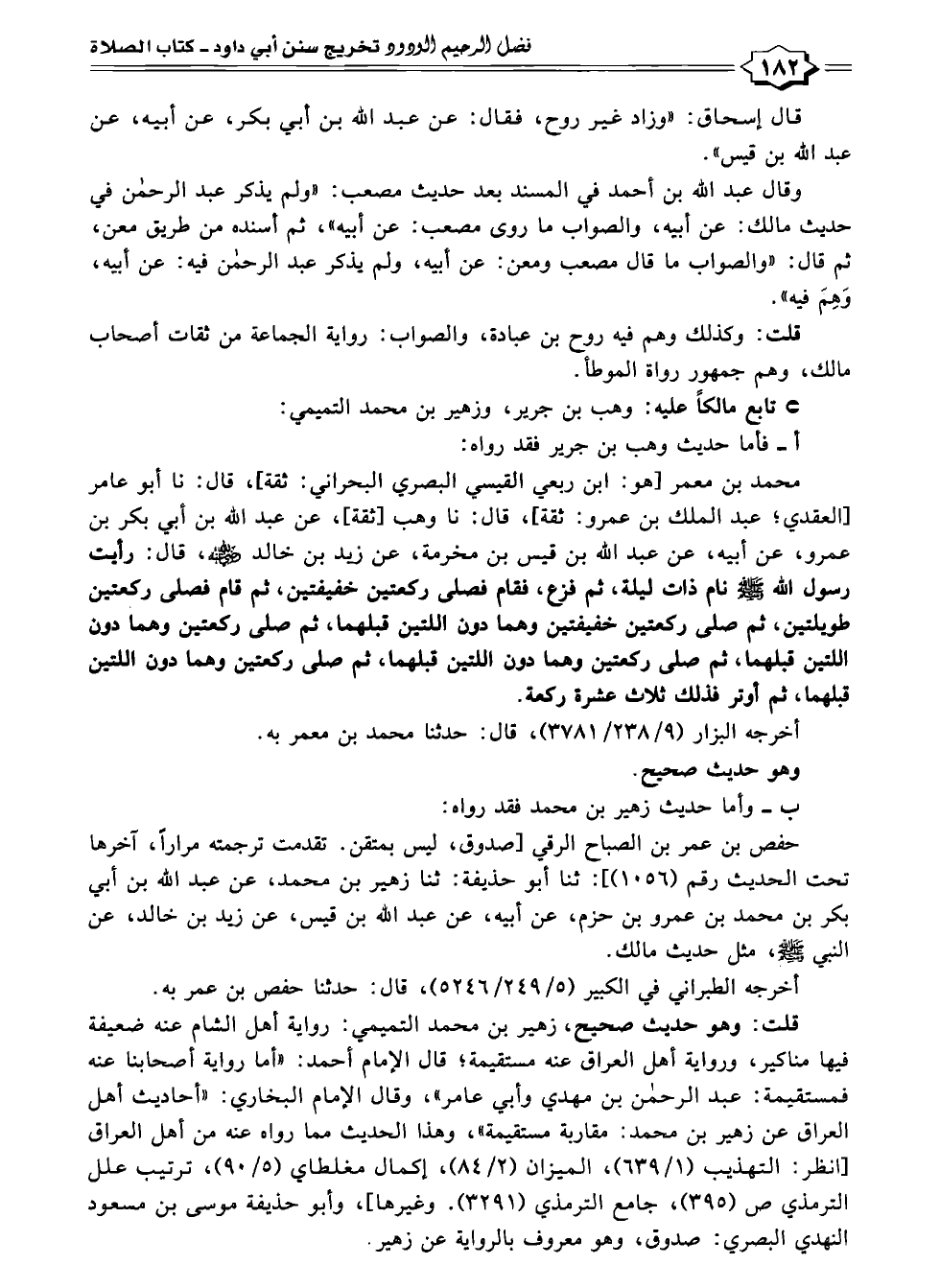 محمد بن معمر [هو: ابن ربعي القيسي البصري البحراني: ثقة]، قال: نا أبو عامر [العقدي؛ عبد الملك بن عمرو: ثقة]، قال: نا وهب [ثقة]، عن عبد الله بن أبي بكر بن عمرو، عن أبيه، عن عبد الله بن قيس بن مخرمة، عن زيد بن خالد - رضي الله عنه -، قال: رأيت رسول الله - صلى الله عليه وسلم - نام ذات ليلة، ثم فزع، فقام فصلى ركعتين خفيفتين، ثم قام فصلى ركعتين طويلتين، ثم صلى ركعتين خفيفتين وهما دون اللتين قبلهما، ثم صلى ركعتين وهما دون اللتين قبلهما، ثم صلى ركعتين وهما دون اللتين قبلهما، ثم صلى ركعتين وهما دون اللتين قبلهما، ثم أوتر فذلك ثلاث عشرة ركعة.