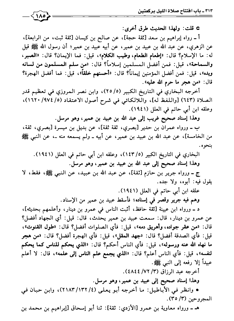 د - ورواه ابن عيينة [ثقة حافظ، أثبت الناس في عمرو بن دينار، وأعلمهم بحديثه]، عن عمرو بن دينار, قال: سمعت عبيد بن عمير يحدث، قال: قيل: أي الجهاد أفضل؟ قال: "من عقر جواده، وأهريق دمه", قيل: فأي الصلوات أفضل؟ قال: "طول القنوت"، قيل: فأي الصدقة أفضل؟ قال: "جهد المقل"، قيل: فأي الهجرة أفضل؟ قال: "من هجر ما نهاه الله عنه ورسوله"، قيل: فأي الناس أحكم؟ قال: "الذي يحكم للناس كما يحكم لنفسه"، قيل: فأي الناس أعلم؟ قال: "الذى يجمع علم الناس إلى علمه"، قال: لا أعلم عبيدًا إلا رفعه إلى النبي - صلى الله عليه وسلم -.