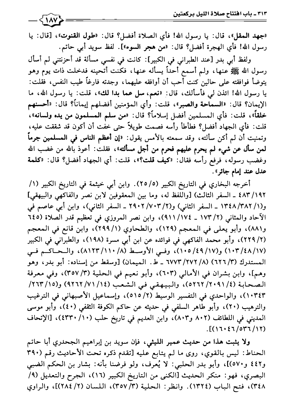 ولفظ أبي بدر [عند الطبراني في الكبير]: كانت في نفسي مسألة قد أحزنتني لم أسأل رسول الله - صلى الله عليه وسلم - عنها، ولم أسمع أحدًا يسأله عنها، فكنت أتحينه فدخلت ذات يوم وهو يتوضأ فوافقته على حالين كنت أحب أن أوافقه عليهما، وجدته فارغًا طيب النفس، فقلت: يا رسول الله! ائذن لي فأسألك، قال: "نعم، سل عما بدا لك"، قلت: يا رسول الله، ما الإيمان؟ قال: "السماحة والصبر"، قلت: وأي المؤمنين أفضلهم إيمانًا؟ قال: "أحسنهم خلقاً"، قلت: فأي المسلمين أفضل إسلامًا؟ قال: "من سلم المسلمون من يده ولسانه"، قلت: فأي الجهاد أفضل؟ فطأطأ رأسه فصمت طويلًا حتى خفت أن أكون قد شققت عليه، وتمنيت أن لم أكن سألته، وقد سمعته بالأمس يقول: "إن أعظم الناس في المسلمين جرمًا لمن سأل عن شيء لم يحرم عليهم فحرم من أجل مسألته"، فقلت: أعوذ بالله من غضب الله وغضب رسوله، فرفع رأسه فقال: "كيف قلت؟ "، قلت: أي الجهاد أفضل؟ قال: "كلمة عدل عند إمام جائر".