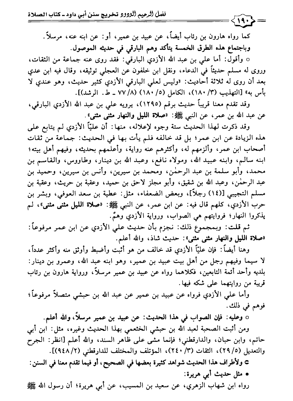 وقد ذكرت لهذا الحديث ستة وجوه لإعلاله، منها: أن عليًّا الأزدي لم يتابع على هذه الزيادة عن ابن عمر؛ بل قد خالفه فلم يأت بها في الحديث: جماعة من ثقات أصحاب ابن عمر، وألزمهم له، وأكثرهم عنه رواية، وأعلمهم بحديثه، وفيهم أهل بيته؛ ابنه سالم، وابنه عبيد الله، ومولاه نافع، وعبد الله بن دينار، وطاووس، والقاسم بن محمد، وأبو سلمة بن عبد الرحمن، ومحمد بن سيرين، وأنس بن سيرين، وحميد بن عبد الرحمن، وعبد الله بن شقيق، وأبو مجلز لاحق بن حميد، وعقبة بن حريث، وعقبة بن مسلم التجيبي [(١٤) رجلًا]، وبعض الضعفاء، مثل: عطية بن سعد العوفي، وبشر بن حرب الأزدي، كلهم قال فيه: عن ابن عمر، عن النبي - صلى الله عليه وسلم -: "صلاة الليل مثنى مثنى"، لم يذكروا النهار؛ فروايتهم هي الصواب، ورواية الأزدي وهمٌ.