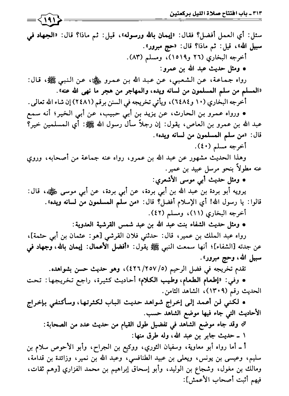 • لكني لن أعمد إلى إخراج شواهد حديث الباب لكثرتها، وسأكتفي بإخراج الأحاديث التي جاء فيها موضع الشاهد حسب.