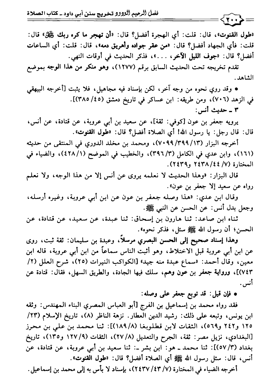فقد رواه محمد بن إسماعيل بن الفرج [أبو العباس المصري البناء المهندس: وثقه ابن يونس، وتبعه على ذلك: رشيد الدين العطار. نزهة الناظر (٨)، تاريخ الإسلام (٢٣/ ١٢٥ و ٢٤٢ و ٥٦٩)، الثقات لابن قطلوبغا (٨/ ١٨٩)]: ثنا محمد بن علي بن محرز [البغدادي، نزيل مصر: ثقة، الجرح والتعديل (٨/ ٢٧)، الثقات (٩/ ١٢٧ و ١٣٥)، تاريخ بغداد (٣/ ٥٧)،: ثنا محمد - هو: ابن بشر -: ثنا سعيد بن أبي عروبة، عن قتادة، عن أنس، قال: سئل رسول الله - صلى الله عليه وسلم - أي الصلاة أفضل؟ قال: "طول الفنوت".