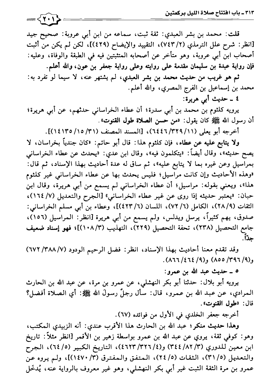 يرويه أبو بلال: حدثنا أبو بكر النهشلي، عن عمرو بن مرة، عن عبد الله بن الحارث المرادي، عن عبد الله بن عمرو، قال: سأل رجلٌ رسولَ الل - صلى الله عليه وسلم -: أي الصلاة أفضل؟ قال: "طول القنوت".