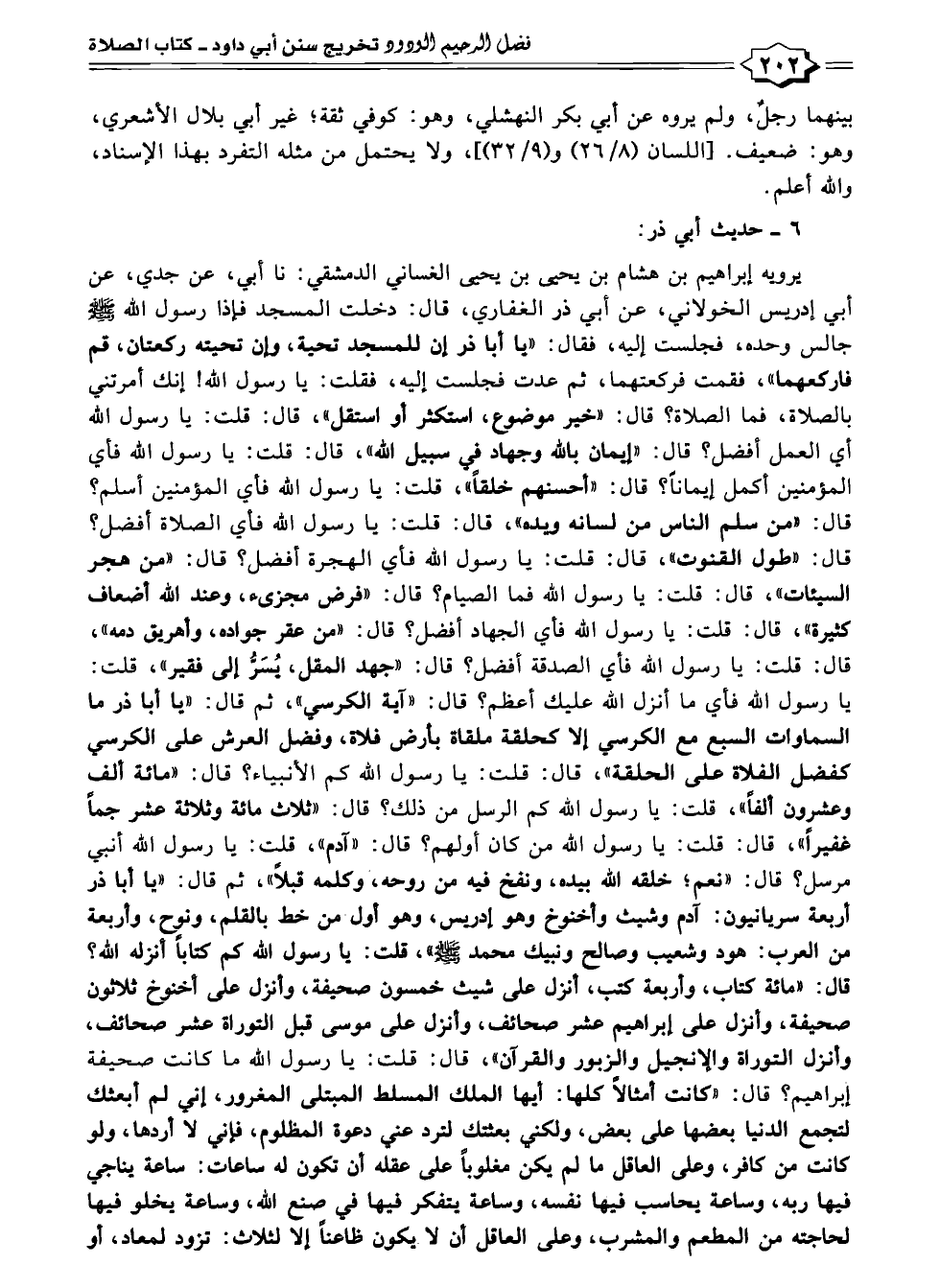 يرويه إبراهيم بن هشام بن يحيى بن يحيى الغساني الدمشقي: نا أبي، عن جدي، عن أبي إدريس الخولاني، عن أبي ذر الغفاري، قال: دخلت المسجد فإذا رسول الله - صلى الله عليه وسلم - جالس وحده، فجلست إليه، فقال: "يا أبا ذر أن للمسجد تحية، وإن تحيته ركعتان، قم فاركعهما"، فقمت فركعتهما، ثم عدت فجلست إليه، فقلت: يا رسول الله! إنك أمرتني بالصلاة، فما الصلاة؟ قال: "خير موضوع، استكثر أو استفل"، قال: قلت: يا رسول الله أي العمل أفضل؟ قال: "إيمان بالله وجهاد في سبيل الله"، قال: قلت: يا رسول الله فأي المؤمنين أكمل إيمانًا؟ قال: "أحسنهم خلقًا"، قلت: يا رسول الله فأي المؤمنين أسلم؟ قال: "من سلم الناس من لسانه ويده"، قال: قلت: يا رسول الله فأي الصلاة أفضل؟ قال: "طول القنوت"، قال: قلت: يا رسول الله فأي الهجرة أفضل؟ قال: "من هجر السيئات"، قال: قلت: يا رسول الله فما الصيام؟ قال: "فرض مجزئ، وعند الله أضعاف كثيرة"، قال: قلت: يا رسول الله فأي الجهاد أفضل؟ قال: "من عقر جواده، وأهريق دمه"، قال: قلت: يا رسول الله فأي الصدقة أفضل؟ قال: "جهد المقل، يُسَرُّ إلى فقير"، قلت: يا رسول الله فأي ما أنزل الله عليك أعظم؟ قال: "آية الكرسي"، ثم قال: "يا أبا ذر ما السماوات السبع مع الكرسي إلا كحلقة ملقاة بأرض فلاة، وفضل العرش على الكرسي كفضل الفلاة على الحلقة"، قال: قلت: يا رسول الله كم الأنبياء؟ قال: "مائة ألف وعشرون ألفًا"، قلت: يا رسول الله كم الرسل من ذلك؟ قال: "ثلاث مائة وثلاثة عشر جمًا غفيرًا"، قال: قلت: يا رسول الله من كان أولهم؟ قال: "آدم"، قلت: يا رسول الله أنبي مرسل؟ قال: "نعم؟ خلقه الله بيده، ونفخ فيه من روحه، وكلمه قبلًا"، ثم قال: "يا أبا ذر أربعة سريانيون: آدم وشيث وأخنوخ وهو إدريس، وهو أول من خط بالقلم، ونوح، وأربعة من العرب: هود وشعيب وصالح ونبيك محمد"، قلت: يا رسول الله كم كتابًا أنزله الله؟ قال: "مائة كتاب، وأربعة كتب، أنزل على شيث خمسون صحيفة، وأنزل على أخنوخ ثلاثون صحيفة، وأنزل على إبراهيم عشر صحائف، وأنزل على موسى قبل التوراة عشر صحائف، وأنزل التوراة والإنجيل والزبور والقرآن"، قال: قلت: يا رسول الله ما كانت صحيفة إبراهيم؟ قال: "كانت أمثالًا كلها: أيها الملك المسلط المبتلى المغرور، إني لم أبعثك لتجمع الدنيا بعضها على بعض، ولكني بعثتك لترد عنى دعوة المظلوم، فإني لا أردها، ولو كانت من كافر، وعلى العاقل ما لم يكن مغلوبًا على عقله أن تكون له ساعات: ساعة يناجي فيها ربه، وساعة يحاسب فيها نفسه، وساعة يتفكر فيها في صنع الله، وساعة يخلو فيها لحاجته من المطعم والمشرب، وعلى العاقل أن لا يكون ظاعنًا إلا لثلاث: تزود لمعاد، أو