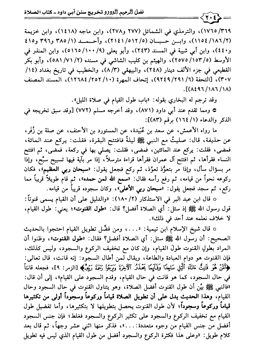ما رواه الأعمش، عن سعد بن عُبَيدة، عن المستورد بن الأحنف، عن صلة بن زُفَر، عن حذيفة، قال: صليتُ مع النبي - صلى الله عليه وسلم - ليلةً فافتتح البقرة، فقلت: يركع عند المائة، فمضى، فقلت: يركع عند المائتين، فمضى، فقلت: يصلي بها في ركعة، فمضى، ثم افتتح النساء فقرأها، ثم افتتح آل عمران فقرأها قراءة مترسلًا، إذا مر بآية فيها تسبيح سبَّح، وإذا مر بسؤال سأل، وإذا مر بتعوُّذ تعوَّذ، ثم ركع فجعل يقول: "سبحان ربي العظيم"، فكان ركوعه نحوًا من قيامه، ثم رفع رأسه فقال: "سمع الله لمن حمده"، ثم قام طويلًا قرببًا مما ركع، ثم سجد فجعل يقول: "سبحان ربى الأعلى"، وكان سجوده قريبًا من قيامه.
