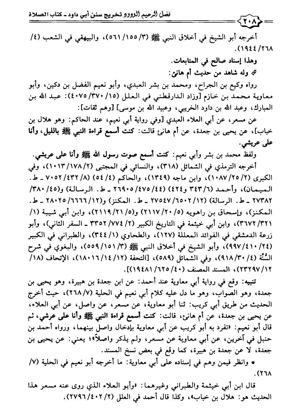 عن مسعر، عن أبي العلاء العبدي [وفي رواية أبي نعيم، عند الحاكم: وهو هلال بن خباب]، عن يحيى بن جعدة، عن أم هانئ قالت: كنت أسمع قراءة النبي - صلى الله عليه وسلم - بالليل، وأنا على عريشي.