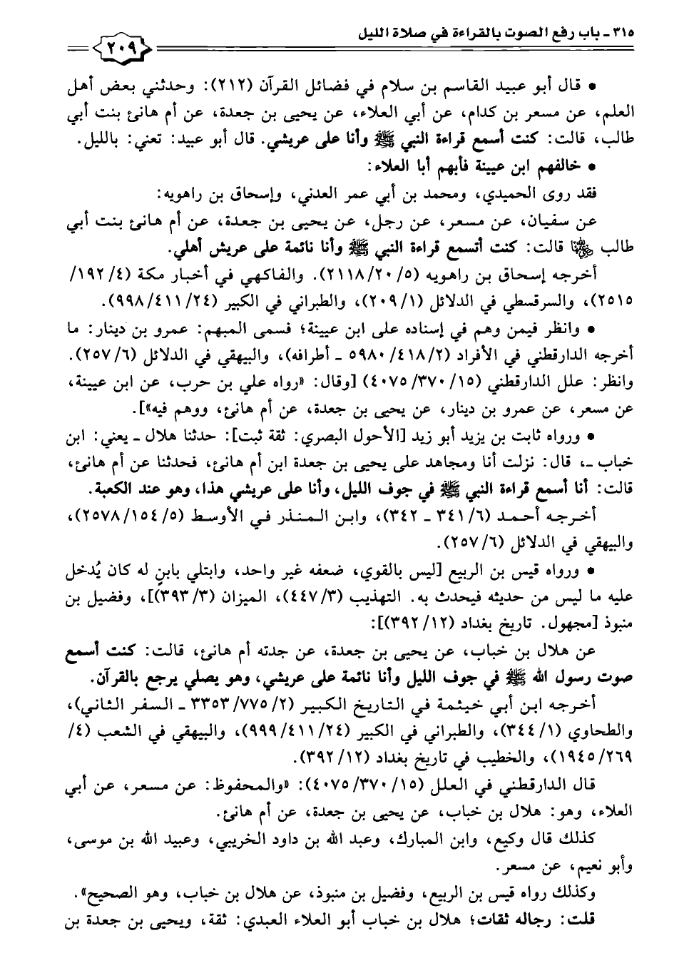 • قال أبو عبيد القاسم بن سلام في فضائل القرآن (٢١٢): وحدثني بعض أهل العلم، عن مسعر بن كدام، عن أبي العلاء، عن يحيى بن جعدة، عن أم هانئ بنت أبي طالب، قالت: كنت أسمع قراءة النبي - صلى الله عليه وسلم - وأنا على عريشي. قال أبو عبيد: تعني: بالليل.