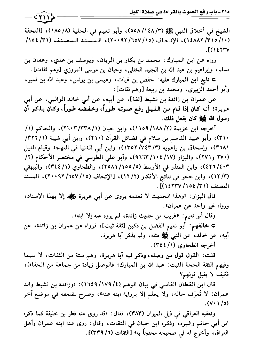 عن عمران بن زائدة بن نشيط [ثقة]، عن أبيه، عن أبي خالد الوالبي، عن أبي هريرة؛ أنه كان إذا قام من الليل رفع صوته طورًا، وخفضه طورًا، وكان يذكر أن رسول الله - صلى الله عليه وسلم - كان يفعل ذلك.
