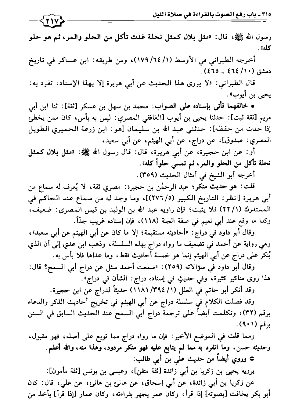 أو: عن ابن حجيرة، عن أبي هريرة، قال: قال رسول الله - صلى الله عليه وسلم -: "مثل بلال كمثل نحلة تأكل من الحلو والمر، ثم تمسي حلوًا كله".