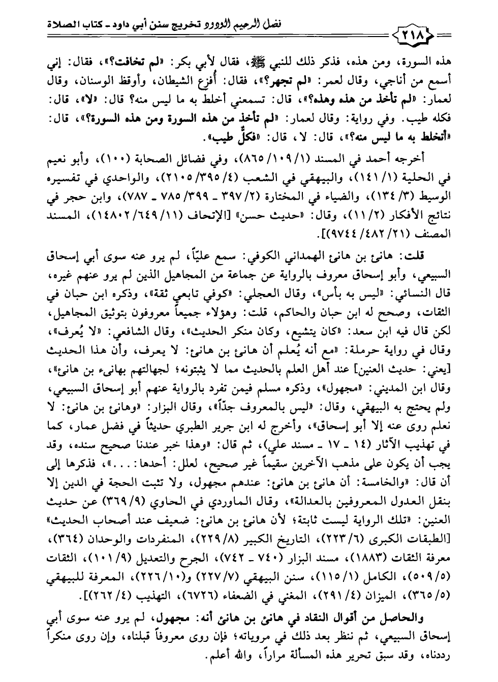 قلت: هانئ بن هانئ الهمداني الكوفي: سمع عليًّا، لم يرو عنه سوى أبي إسحاق السبيعي، وأبو إسحاق معروف بالرواية عن جماعة من المجاهيل الذين لم يرو عنهم غيره، قال النسائي: "ليس به بأس"، وقال العجلي: "كوفي تابعي ثقة"، وذكره ابن حبان في الثقات، وصحح له ابن حبان والحاكم، قلت: وهؤلاء جميعًا معروفون بتوثيق المجاهيل، لكن قال فيه ابن سعد: "كان يتشيع، وكان منكر الحديث"، وقال الشافعي: "لا يُعرف"، وقال في رواية حرملة: "مع أنه يُعلم أن هانئ بن هانئ: لا يعرف، وأن هذا الحديث [يعني: حديث العنين] عند أهل العلم بالحديث مما لا يثبتونه؛ لجهالتهم بهانئ بن هانئ"، وقال ابن المديني: "مجهول"، وذكره مسلم فيمن تفرد بالرواية عنهم أبو إسحاق السبيعي، ولم يحتج به البيهقي، وقال: "ليس بالمعروف جدًّا"، وقال البزار: "وهانئ بن هانئ: لا نعلم روى عنه إلا أبو إسحاق"، وأخرج له ابن جرير الطبري حديثًا في فضل عمار، كما في تهذيب الآثار (١٤ - ١٧ - مسند علي)، ثم قال: "وهذا خبر عندنا صحيح سنده، وقد يجب أن يكون على مذهب الآخرين سقيمًا غير صحيح، لعلل: أحدها: ... "، فذكرها إلى أن قال: "والخامسة: أن هانئ بن هانئ: عندهم مجهول، ولا تثبت الحجة في الدين إلا بنقل العدول المعروفين بالعدالة"، وقال الماوردي في الحاوي (٩/ ٣٦٩) عن حديث العنين: "تلك الرواية ليست ثابتة؛ لأن هانئ بن هانئ: ضعيف عند أصحاب الحديث" [الطبقات الكبرى (٦/ ٢٢٣)، التاريخ الكبير (٨/ ٢٢٩)، المنفردات والوحدان (٣٦٤)، معرفة الثقات (١٨٨٣)، مسند البزار (٧٤٠ - ٧٤٢)، الجرح والتعديل (٩/ ١٠١)، الثقات (٥/ ٥٠٩)، الكامل (١/ ١١٥)، سنن البيهقي (٧/ ٢٢٧) و (١٠/ ٢٢٦)، المعرفة للبيهقي (٥/ ٣٦٥)، الميزان (٤/ ٢٩١)، المغني في الضعفاء (٦٧٢٦)، التهذيب (٤/ ٢٦٢)].