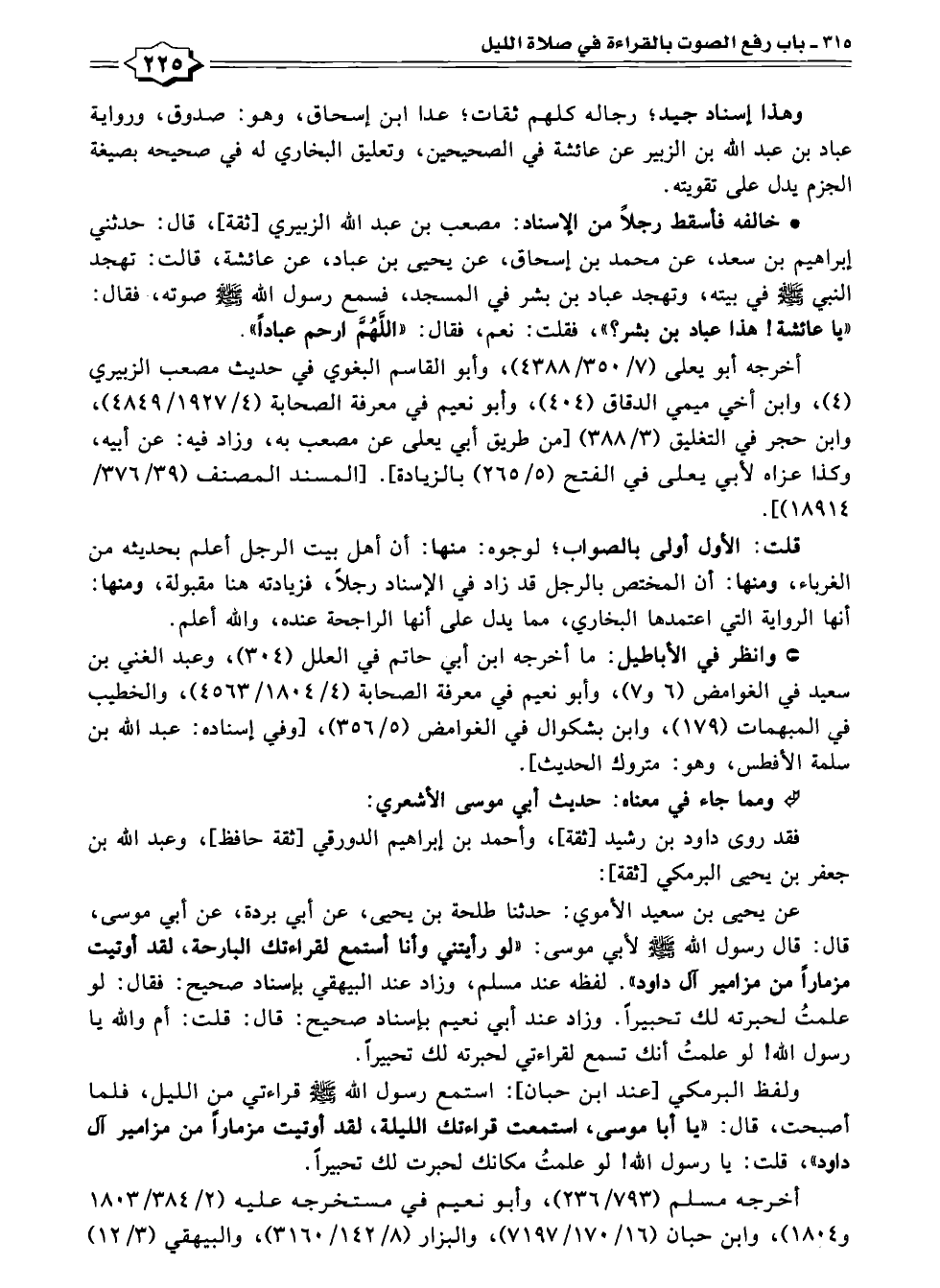 عن يحيى بن سعيد الأموي: حدثنا طلحة بن يحيى، عن أبي بردة، عن أبي موسى، قال: قال رسول الله - صلى الله عليه وسلم - لأبي موسى: "لو رأيتني وأنا أستمع لقراءتك البارحة، لقد أوتيت مزمارًا من مزامير آل داود". لفظه عند مسلم، وزاد عند البيهقي بإسناد صحيح: فقال: لو علمتُ لحبرته لك تحبيرًا. وزاد عند أبي نعيم بإسناد صحيح: قال: قلت: أم والله يا رسول الله! لو علمتُ أنك تسمع لقراءتي لحبرته لك تحبيرًا.