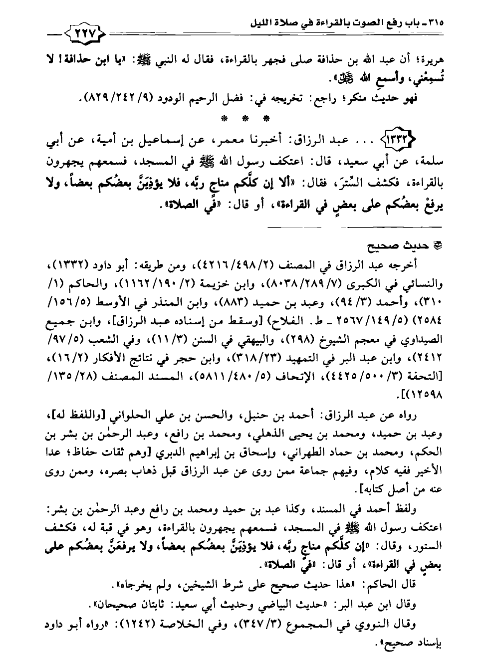 ١٣٣٢ - . . . عبد الرزاق: أخبرنا معمر، عن إسماعيل بن أمية، عن أبي سلمة، عن أبي سعيد، قال: اعتكف رسول الله - صلى الله عليه وسلم - في المسجد، فسمعهم يجهرون بالقراءة، فكشف السِّترَ، فقال: "ألا إن كلَّكم مناجٍ ربِّه، فلا يؤذِيَنَّ بعضُكم بعضًا، ولا يرفعْ بعضُكم على بعضٍ في القراءة"، أو قال: "في الصلاة".