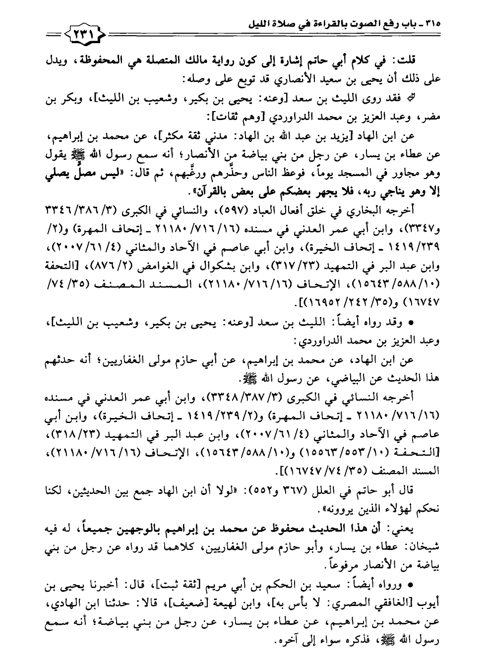 عن ابن الهاد [يزيد بن عبد الله بن الهاد: مدني ثقة مكثر]، عن محمد بن إبراهيم، عن عطاء بن يسار، عن رجل من بني بياضة من الأنصار؛ أنه سمع رسول الله - صلى الله عليه وسلم - يقول وهو مجاور في المسجد يومًا، فوعظ الناس وحذَّرهم ورغَبهم، ثم قال: "ليس مصلٍّ يصلي إلا وهو يناجي ربه، فلا يجهر بعضكم على بعض بالقرآن".