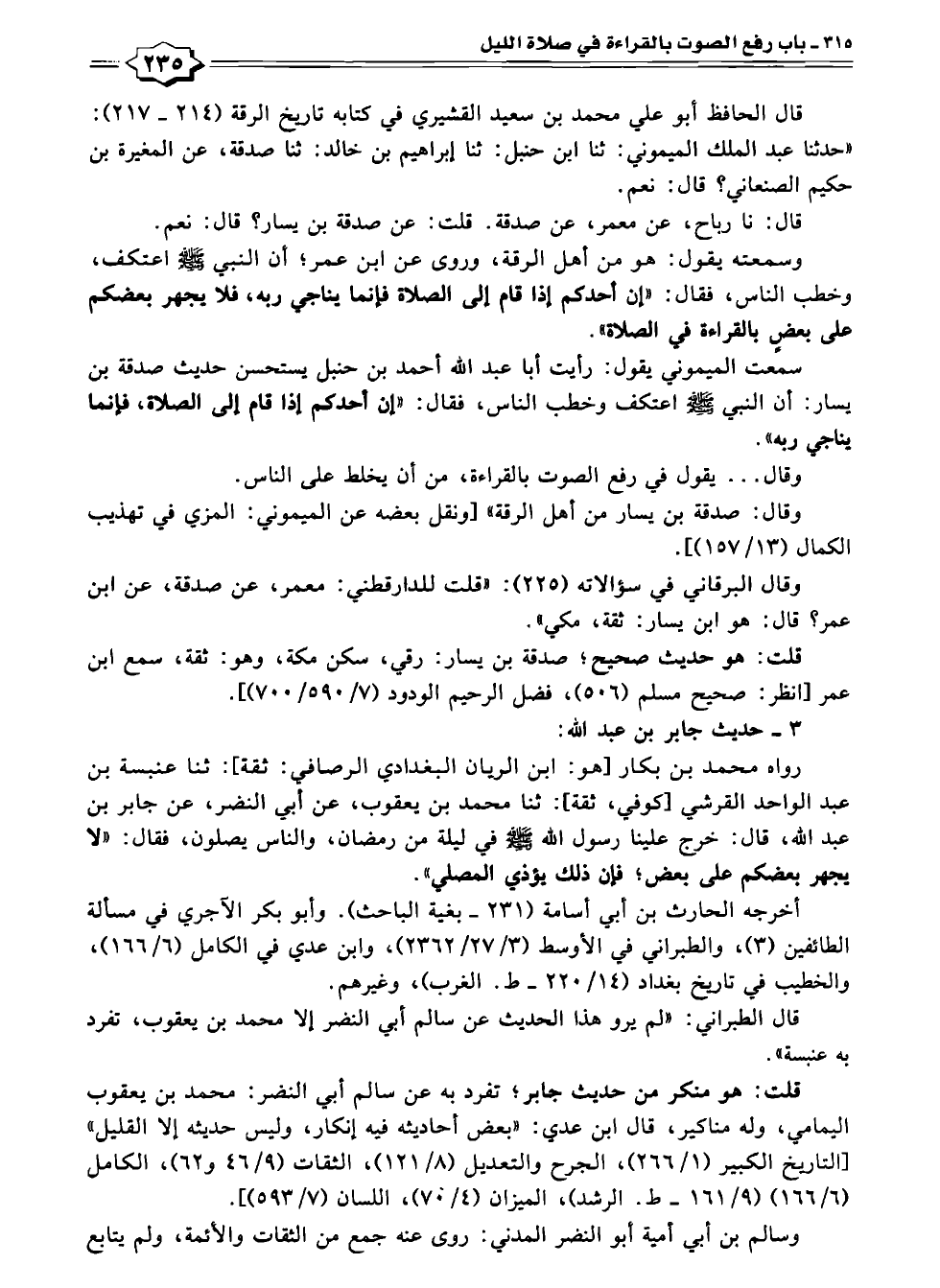 رواه محمد بن بكار [هو: ابن الريان البغدادي الرصافي: ثقة]: ثنا عنبسة بن عبد الواحد القرشي [كوفي، ثقة]: ثنا محمد بن يعقوب، عن أبي النضر، عن جابر بن عبد الله، قالى: خرج علينا رسول الله - صلى الله عليه وسلم - في ليلة من رمضان، والناس يصلون، فقال: "لا يجهر بعضكم على بعض؛ فإن ذلك يؤذي المصلى".