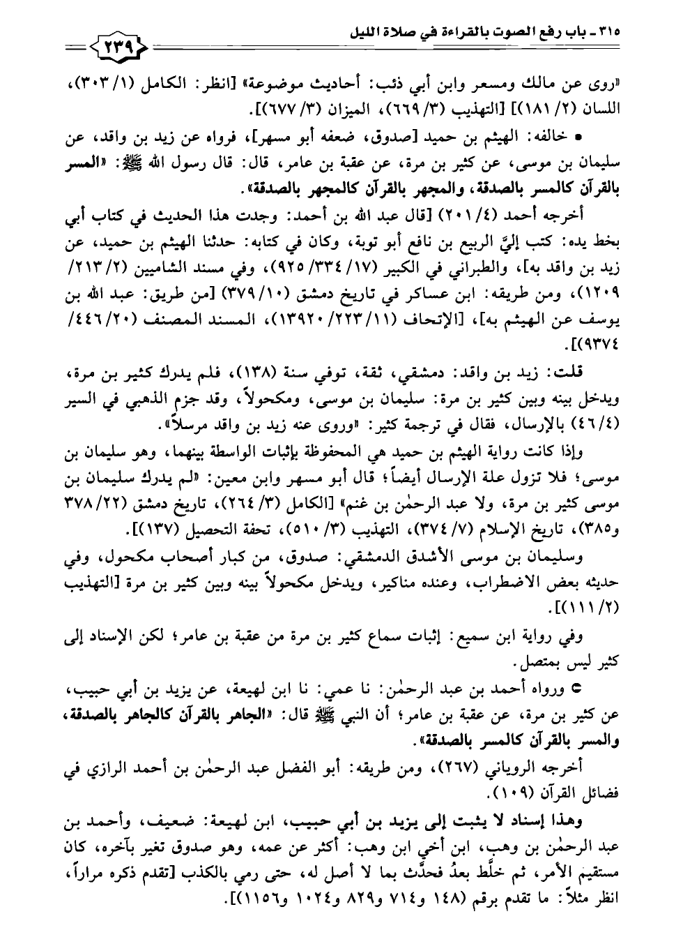 * ورواه أحمد بن عبد الرحمن: نا عمي: نا ابن لهيعة، عن يزيد بن أبي حبيب، عن كثير بن مرة، عن عقبة بن عامر؛ أن النبي - صلى الله عليه وسلم - قال: "الجاهر بالقرآن كالجاهر بالصدقة، والمسر بالقرآن كالمسر بالصدقة".
