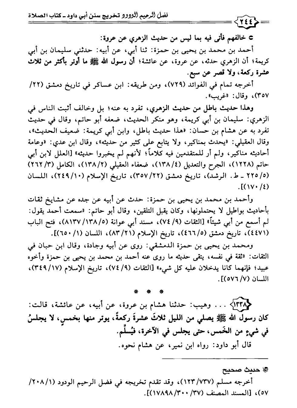 ١٣٣٨ - . . . وهيب: حدثنا هشام بن عروة، عن أبيه، عن عائشة، قالت: كان رسول الله - صلى الله عليه وسلم - يصلي من الليل ثلاثَ عشرةَ ركعةً، يوتر منها بخمسٍ، لا يجلسُ في شيءٍ من الخَمس، حتى يجلس في الآخرة، فيُسلِّم، قال أبو داود: رواه ابن نمير، عن هشام نحوه.