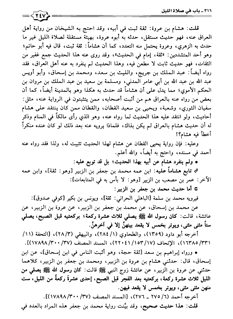 قلت: هشام بن عروة: ثقة ثبت في أبيه، وقد احتج به الشيخان من رواية أهل العراق عنه، فهو حديث مستقل، حدثه به أبوه عروة، بهيئة مستقلة لصلاة الليل غير ما حدث به الزهري، وعروة يحتمل منه التعدد، كما أن هشامًا: ثقة ثبت، قال فيه أبو حاتم؛ وهو أحد المتشددين: "ثقة، إمام في الحديث"، وقد روى عنه هذا الحديث جمع غفير من الثقات، فهو حديث ثابت لا مطعن فيه، وهذا الحديث لم ينفرد به عنه أهل العراق، فقد رواه أيضًا: عبد الملك بن جريج، والليث بن سعد، ومحمد بن إسحاق، وأبو أويس عبد الله بن عبد الله بن أبي عامر المدني، ومسلمة بن سعيد بن عبد الملك بن مروان بن الحكم الأموي؛ مما يدل على أن هشامًا قد حدث به هكذا وهو بالمدينة أيضًا، كما أن بعض من رواه عنه بالعراق هم من أثبت أصحابه، ممن يتثبتون في الرواية عنه، مثل: سفيان الثوري، وشعبة، ويحيى بن سعيد القطان، والقطان ممن كان ينتقد على هشام أحاديث، ولو انتقد عليه هذا الحديث لما رواه عنه، وهو الذي رأى مالكًا في المنام وذكر له أن حديث هشام بالعراق لم يكن بذاك، فلماذا يرويه عنه بعد ذلك لو كان عنده منكرًا أخطأ فيه هشام؟!