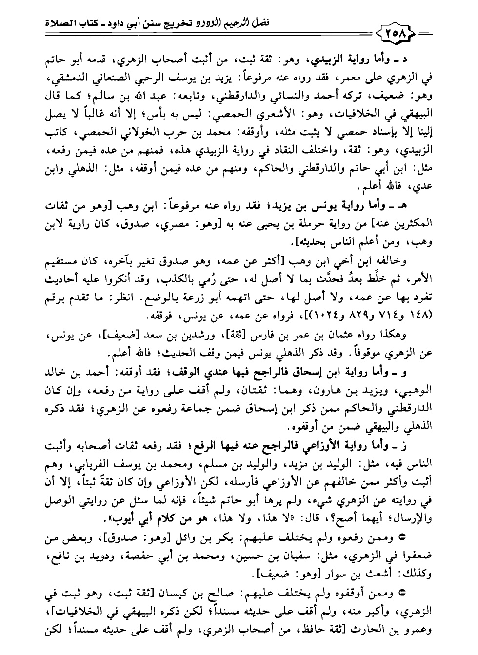 د - وأما رواية الزبيدي، وهو: ثقة ثبت، من أثبت أصحاب الزُّهري، قدمه أبو حاتم في الزُّهري على معمر، فقد رواه عنه مرفوعًا: يزيد بن يوسف الرحبي الصنعاني الدمشقي، وهو: ضعيف، تركه أحمد والنسائي والدارقطني، وتابعه: عبد الله بن سالم؛ كما قال البيهقيّ في الخلافيات، وهو: الأشعري الحمصي: ليس به بأس؛ إِلَّا أنه غالبًا لا يصل إلينا إِلَّا بإسناد حمصي لا يثبت مثله، وأوقفه: محمد بن حرب الخولاني الحمصي، كاتب الزبيدي، وهو: ثقة، واختلف النقاد في رواية الزبيدي هذه، فمنهم من عده فيمن رفعه، مثل: ابن أبي حاتم والدارقطني والحاكم، ومنهم من عده فيمن أوقفه، مثل: الذهلي وابن عدي، فالله أعلم.