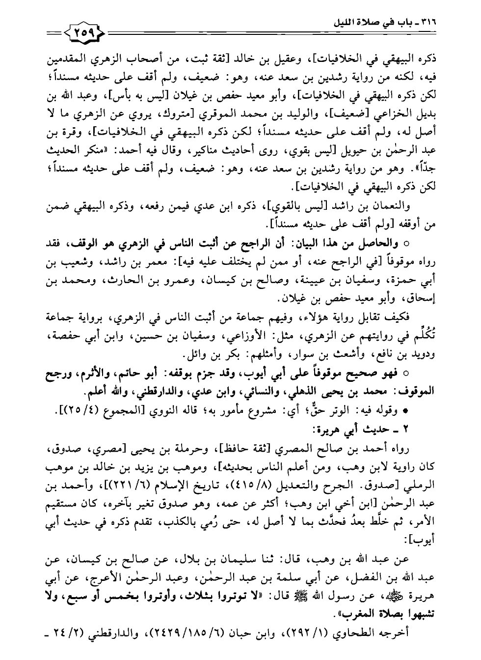 عن عبد اللّه بن وهب، قال: ثنا سليمان بن بلال، عن صالح بن كيسان، عن عبد اللّه بن الفضل، عن أبي سلمة بن عبد الرحمن، وعبد الرحمن الأعرج، عن أبي هريرة - رضي الله عنه -، عن رسول اللّه - صلى الله عليه وسلم - قال: "لا توتروا بثلاث، وأوتروا بخمس أو سبع، ولا تشبهوا بصلاة المغرب".