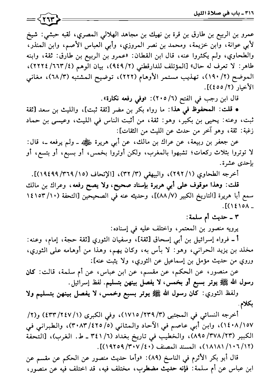 عن منصور، عن الحكم، عن مقسم، عن ابن عباس، عن أم سلمة، قالت: كان رسول الله - صلى الله عليه وسلم - يوتر بسبع أو بخمس، لا يفصل بينهن بتسليم. لفظ إسرائيل.