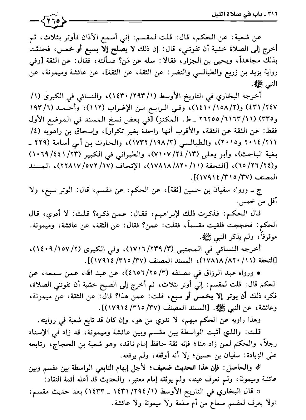 عن شعبة، عن الحكم، قال: قلت لمقسم: إني أسمع الأذان فأوتر بثلاث، ثم أخرج إلى الصلاة خشية أن تفوتني، قال: إن ذلك لا يصلح إِلَّا بسبع أو خمس، فحدثت بذلك مجاهدًا، ويحيى بن الجزار، فقالا: سله عن مَن؟ فسألته، فقال: عن الثقة [وفي رواية يزيد بن زريع والطيالسي والنضر: عن الثقة، عن الثقة]، عن عائشة وميمونة، عن النَّبِيّ - صلى الله عليه وسلم -.