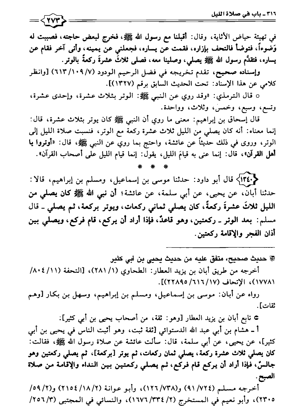 أ - هشام بن أبي عبد اللّه الدستوائي [ثقة ثبت، وهو أثبت الناس في يحيى بن أبي كثير]، عن يحيى، عن أبي سلمة]. قال: سألت عائشة عن صلاة رسول اللّه - صلى الله عليه وسلم -، فقالت: كان يصلي ثلاث عشرة ركعة، يصلي ثمان ركعات، ثم يوتر [بركعة] ثم يصلي ركعتين وهو جالسٌ، فإذا أراد أن يركع قام فركع، ثم بصلي ركعتين بين النداء والإقامة من صلاة الصبح.