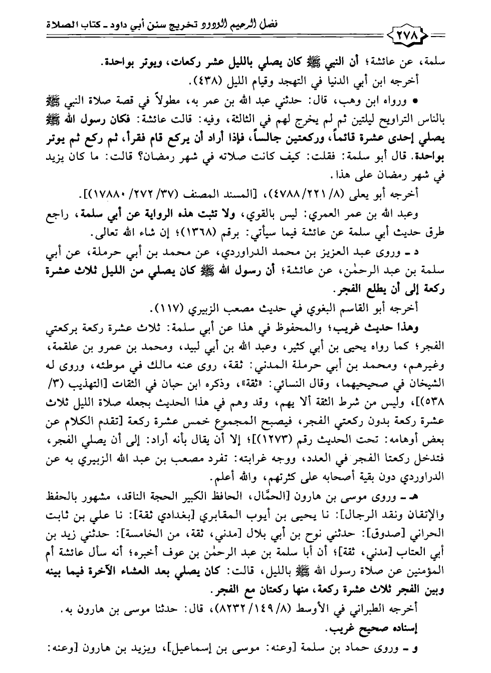 هـ - وروى موسى بن هارون [الحمَّال، الحافظ الكبير الحجة الناقد، مشهور بالحفظ والإتقان ونقد الرجال]: نا يحيى بن أيوب المقابري [بغدادي ثقة]: نا علي بن ثابت الحراني [صدوق]: حدثني نوح بن أبي بلال [مدني، ثقة، من الخامسة]: حَدَّثَنِي زيد بن أبي العتاب [مدني، ثقة]؛ أن أبا سلمة بن عبد الرحمن بن عوف أخبره؛ أنه سأل عائشة أم المؤمنين عن صلاة رسول الله - صلى الله عليه وسلم - بالليل، قالت: كان يصلي بعد العشاء الآخرة فيما بينه وبين الفجر ثلاث عشرة ركعة، منها ركعتان مع الفجر.