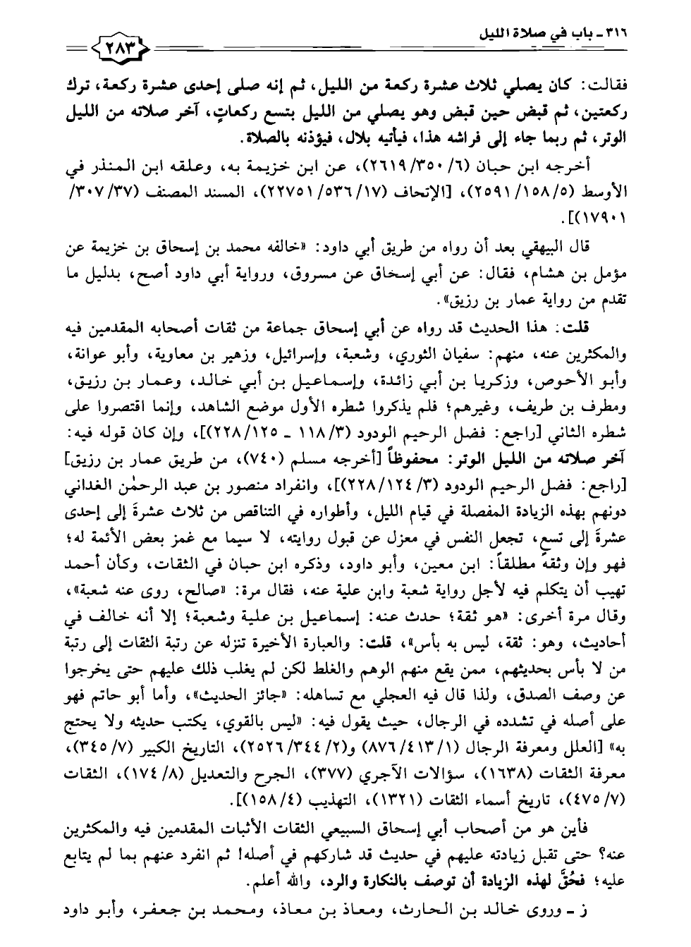 قلت: هذا الحديث قد رواه عن أبي إسحاق جماعة من ثقات أصحابه المقدمين فيه والمكثرين عنه، منهم: سفيان الثوري، وشعبة، وإسرائيل، وزهير بن معاوية، وأبو عوانة، وأبو الأحوص، وزكريا بن أبي زائدة، وإسماعيل بن أبي خالد، وعمار بن رزيق، ومطرف بن طريف، وغيرهم؛ فلم يذكروا شطره الأول موضع الشاهد، وإنما اقتصروا على شطره الثاني [راجع: فضل الرحيم الودود (٣/ ١١٨ - ١٢٥/ ٢٢٨)]، وإن كان قوله فيه: آخر صلاله من الليل الوتر: محفوظًا [أخرجه مسلم (٧٤٠)، من طريق عمار بن رزيق] [راجع: فضل الرحيم الودود (٣/ ١٢٤/ ٢٢٨)]، وانفراد منصور بن عبد الرحمن الغداني دونهم بهذه الزيادة المفصلة في قيام الليل، وأطواره في التناقص من ثلاث عشرةَ إلى إحدى عشرةَ إلى تسع، تجعل النفس في معزل عن قبول روايته، لا سيما مع غمز بعض الأئمة له؛ فهو وإن وثقه مطلقًا: ابن معين، وأبو داود، وذكره ابن حبان في الثقات، وكان أحمد تهيب أن يتكلم فيه لأجل رواية شعبة وابن عليه عنه، فقال مرة: "صالح، روى عنه شعبة"، وقال مرة أخرى: "هو ثقة؛ حدث عنه: إسماعيل بن عليه وشعبة" إِلَّا أنه خالف في أحاديث، وهو: ثقة، ليس به بأس"، قلت: والعبارة الأخيرة تنزله عن رتبة الثقات إلى رتبة من لا بأس بحديثهم، ممن يقع منهم الوهم والغلط لكن لم يغلب ذلك عليهم حتى يخرجوا عن وصف الصدق، ولذا قال فيه العجلي مع تساهله: "جائز الحديث"، وأما أبو حاتم فهو على أصله في تشدده في الرجال، حيث يقول فيه: "ليس بالقوي، يكتب حديثه ولا يحتج به" [العلل ومعرفة الرجال (١/ ٤١٣/ ٨٧٦) و (٢/ ٣٤٤/ ٢٥٢٦)، التاريخ الكبير (٧/ ٣٤٥)، معرفة الثقات (١٦٣٨)، سؤالات الآجري (٣٧٧)، الجرح والتعديل (٨/ ١٧٤)، الثقات (٧/ ٤٧٥)، تاريخ أسماء الثقات (١٣٢١)، التهذيب (٤/ ١٥٨)].