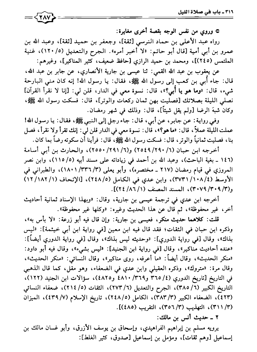 عن يعقوب بن عبد الله القمي: ثنا عيسى بن جارية الأنصاري، عن جابر بن عبد اللّه، قال: جاء أُبي بن كعب إلى رسول اللّه - صلى الله عليه وسلم -، فقال: يا رسول الله! إنه كان مني البارحة شيء، قال: "وما هو يا أُبي؟ "، قال: نسوة معي في الدار، قلن لي: [إنا لا نقرأ القرآن] نصلي الليلة بصلاتك [فصليت بهن ثمان ركعات والوتر]، قال: فسكت رسول الله - صلى الله عليه وسلم -، وكان شبهَ الرضا [ولم يقل شيئًا]، قال: وذلك في شهر رمضان.