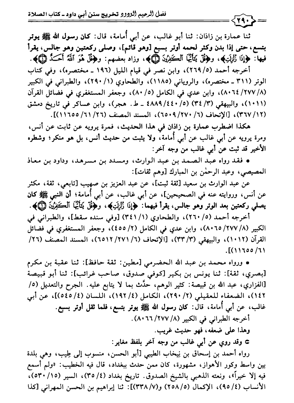 أخرجه أحمد (٥/ ٢٦٩)، وابن نصر في قيام الليل (١٩٦ - مختصره)، وفي كتاب الوتر (٣١١ - مختصره)، والروياني (١١٨٥)، والطحاوي (١/ ٢٩٥)، والطبراني في الكبير (٨/ ٢٧٧/ ٨٠٦٤)، وابن عدي في الكامل (٥/ ٨٠)، وجعفر المستغفري في فضائل القرآن (١٠١١)، والبيهقي (٣/ ٣٤) (٥/ ٤٤٠/ ٤٨٨٩ - ط. هجر)، وابن عساكر في تاريخ دمشق (١٢/ ٣٦٧)، [الإتحاف (٦/ ٢٧٠/ ٦٥٠٩)، المسند المصنف (٢٦/ ٦١/ ١١٦٥٥)].