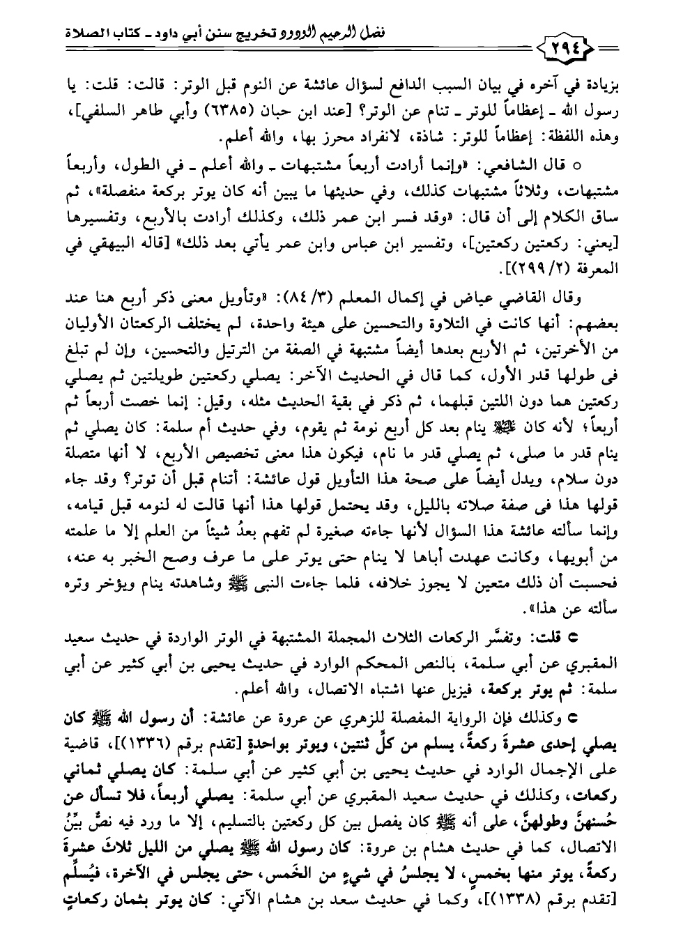 * قلت: وتفسَّر الركعات الثلاث المجملة المشتبهة في الوتر الواردة في حديث سعيد المقبري عن أبي سلمة، بالنص المحكم الوارد في حديث يحيى بن أبي كثير عن أبي سلمة: ثم يوتر بركعة، فيزيل عنها اشتباه الاتصال، والله أعلم.