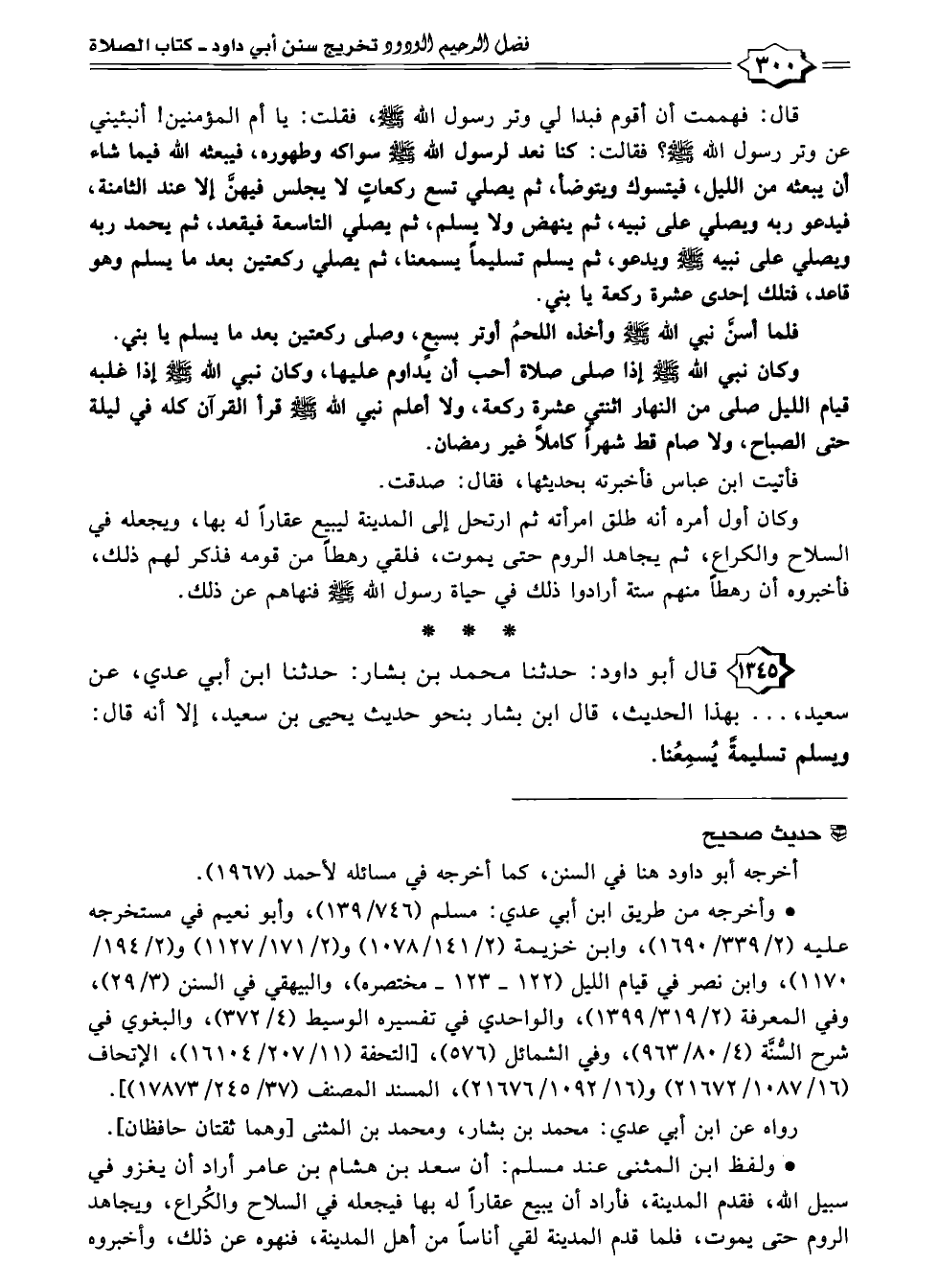 * وأخرجه من طريق ابن أبي عدي: مسلم (٧٤٦/ ١٣٩)، وأبو نعيم في مستخرجه عليه (٢/ ٣٣٩/ ١٦٩٠)، وابن خزيمة (٢/ ١٤١/ ١٠٧٨) و (٢/ ١٧١/ ١١٢٧) و (٢/ ١٩٤/ ١١٧٠)، وابن نصر في قيام الليل (١٢٢ - ١٢٣ - مختصره)، والبيهقي في السنن (٣/ ٢٩)، وفي المعرفة (٢/ ٣١٩/ ١٣٩٩)، والواحدي في تفسيره الوسيط (٤/ ٣٧٢)، والبغوي في شرح السُّنَّة (٤/ ٨٠/ ٩٦٣)، وفي الشمائل (٥٧٦)، [التحفة (١١/ ٢٠٧/ ١٦١٠٤)، الإتحاف (١٦/ ١٠٨٧/ ٢١٦٧٢) و (١٦/ ١٠٩٢/ ٢١٦٧٦)، المسند المصنف (٣٧/ ٢٤٥/ ١٧٨٧٣)].