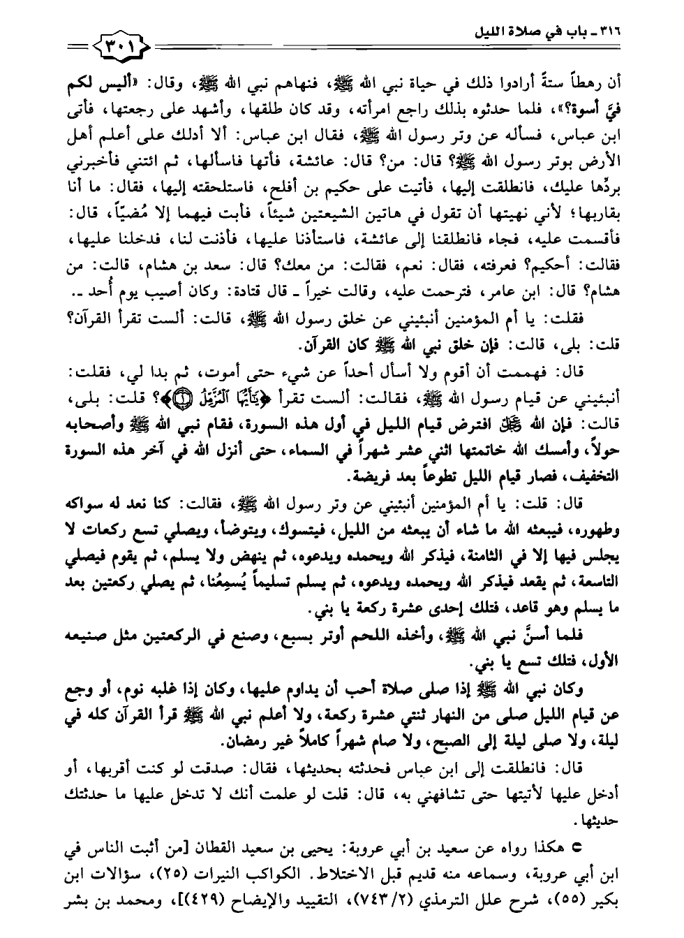 أن رهطاً ستةً أرادوا ذلك في حياة نبي الله - صلى الله عليه وسلم -، فنهاهم نبي الله - صلى الله عليه وسلم -، وقال: "أليس لكم فيَّ أسوة؟ "، فلما حدثوه بذلك راجع امرأته، وقد كان طلقها، وأشهد على رجعتها، فأتى ابن عباس، فسأله عن وتر رسول الله - صلى الله عليه وسلم -، فقال ابن عباس: ألا أدلك على أعلم أهل الأرض بوتر رسول اللّه - صلى الله عليه وسلم - قال: من؟ قال: عائشة، فأتها فاسألها، ثم ائتني فأخبرني بردِّها عليك، فانطلقت إليها، فأتيت على حكيم بن أفلح، فاستلحقته إليها، فقال: ما أنا بقاربها؛ لأني نهيتها أن تقول في هاتين الشيعتين شيئاً، فأبت فيهما إلا مُضيًّا، قال: فأقسمت عليه، فجاء فانطلقنا إلى عائشة، فاستأذنا عليها، فأذنت لنا، فدخلنا عليها، فقالت: أحكيم؟ فعرفته، فقال: نعم، فقالت: من معك؟ قال: سعد بن هشام، قالت: من هشام؟ قال: ابن عامر، فترحمت عليه، وقالت خيراً - قال قتادة: وكان أصيب يوم أُحد -.