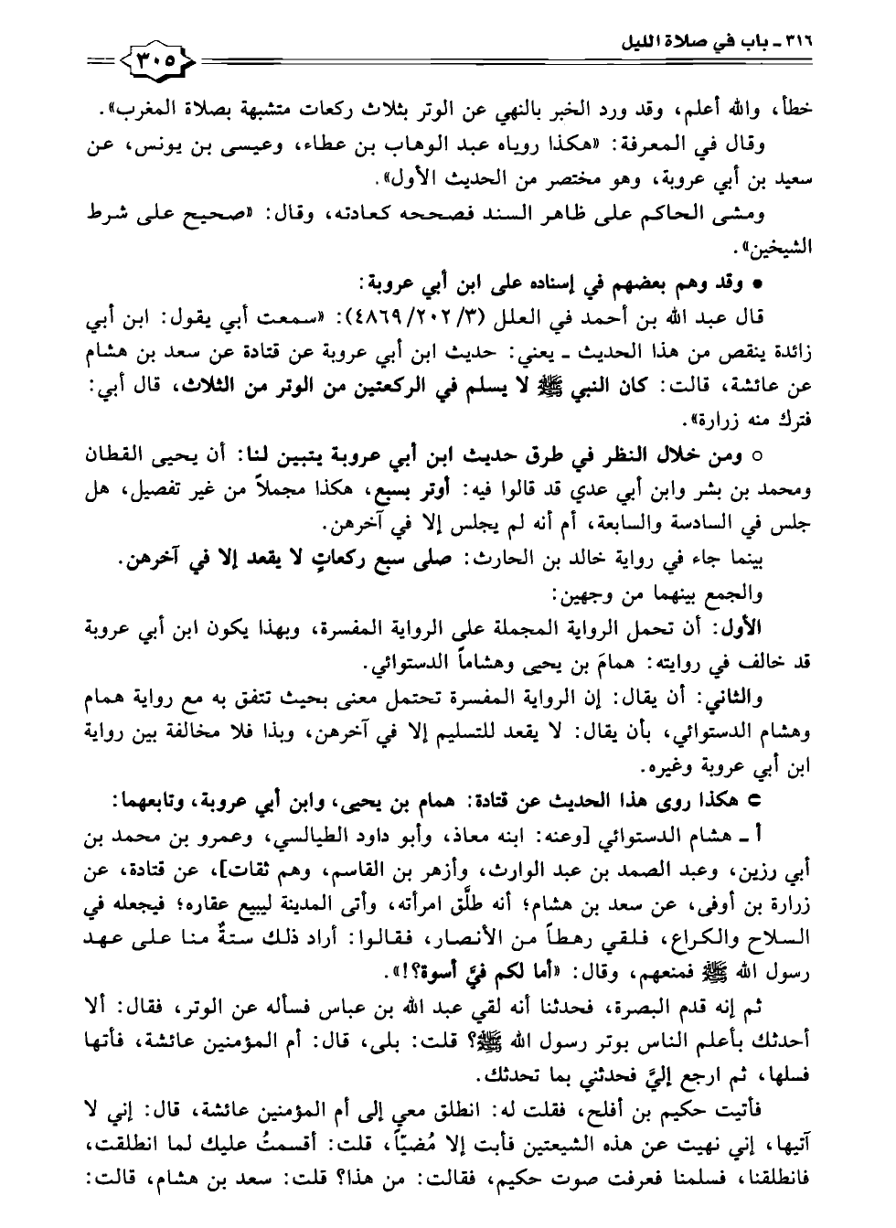 * ومن خلال النظر في طرق حديث ابن أبي عروبة يتبين لنا: أن يحيى القطان ومحمد بن بشر وابن أبي عدي قد قالوا فيه: أوتر بسبع، هكذا مجملاً من غير تفصيل، هل جلس في السادسة والسابعة، أم أنه لم يجلس إلا في آخرهن.
