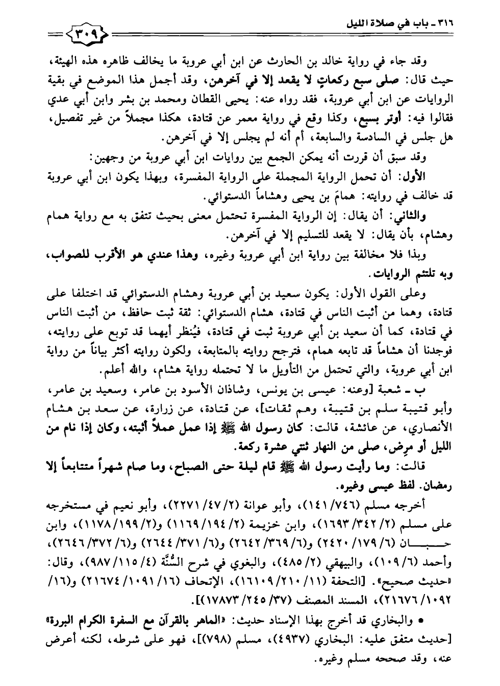 وقد جاء في رواية خالد بن الحارث عن ابن أبي عروبة ما يخالف ظاهره هذه الهيئة، حيث قال: صلى سبع ركعاتٍ لا يقعد إلا في آخرهن، وقد أجمل هذا الموضع في بقية الروايات عن ابن أبي عروبة، فقد رواه عنه: يحيى القطان ومحمد بن بشر وابن أبي عدي فقالوا فيه: أوتر بسبع، وكذا وقع في رواية معمر عن قتادة، هكذا مجملاً من غير تفصيل، هل جلس في السادسة والسابعة، أم أنه لم يجلس إلا في آخرهن.