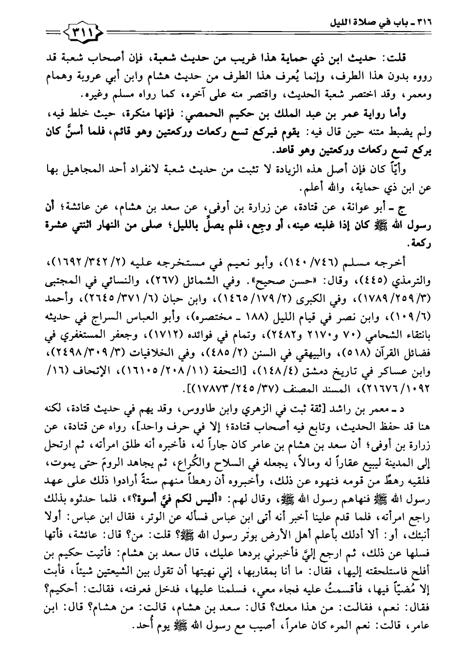 د- معمر بن راشد [ثقة ثبت في الزهري وابن طاووس، وقد يهم في حديث قتادة، لكنه هنا قد حفظ الحديث، وتابع فيه أصحاب قتادة؛ إلا في حرف واحد]، رواه عن قتادة، عن زرارة بن أوفى؛ أن سعد بن هشام بن عامر كان جاراً له، فأخبره أنه طلق امرأته، ثم ارتحل إلى المدينة ليبيع عقاراً له ومالاً، يجعله في السلاح والكُراع، ثم يجاهد الرومَ حتى يموت، فلقيه رهطٌ من قومه فنهوه عن ذلك، وأخبروه أن رهطاً منهم ستةً أرادوا ذلك على عهد رسول الله - صلى الله عليه وسلم - فنهاهم رسول الله - صلى الله عليه وسلم -، وقال لهم: "أليس لكم فيَّ أسوة؟ "، فلما حدثوه بذلك راجع امرأته، فلما قدم علينا أخبر أنه أتى ابن عباس فسأله عن الوتر، فقال ابن عباس: أولا أنبئك، أو: ألا أدلك بأعلم أهل الأرض بوتر رسول الله - صلى الله عليه وسلم -؟ قلت: من؟ قال: عائشة، فأتها فسلها عن ذلك، ثم ارجع إليَّ فأخبرني بردها عليك، قال سعد بن هشام: فأتيت حكيم بن أفلح فاستلحقته إليها، فقال: ما أنا بمقاربها، إني نهيتها أن تقول بين الشيعتين شيئاً، فأبت إلا مُضيًّا فيها، فأقسمتُ عليه فجاء معي، فسلمنا عليها، فدخل فعرفته، فقالت: أحكيم؟ فقال: نعم، فقالت: من هذا معك؟ قال: سعد بن هشام، قالت: من هشام؟ قال: ابن عامر، قالت: نعم المرء كان عامراً، أصيب مع رسول الله - صلى الله عليه وسلم - يوم أُحد.
