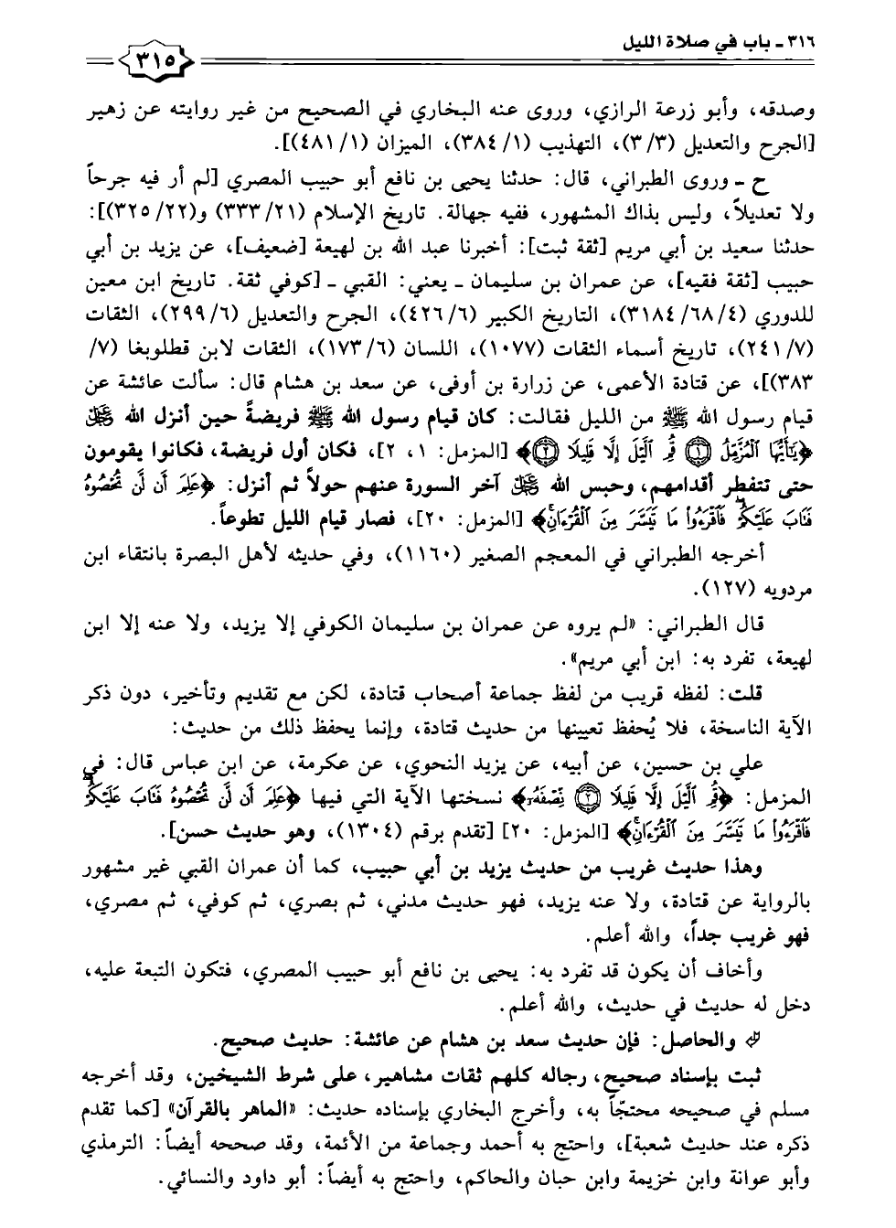 ح - وروى الطبراني، قال: حدثنا يحيى بن نافع أبو حبيب المصري [لم أر فيه جرحاً ولا تعديلاً، وليس بذاك المشهور، ففيه جهالة. تاريخ الإسلام (٢١/ ٣٣٣) و (٢٢/ ٣٢٥)]: حدثنا سعيد بن أبي مريم [ثقة ثبت]: أخبرنا عبد الله بن لهيعة [ضعيف]، عن يزيد بن أبي حبيب [ثقة فقيه]، عن عمران بن سليمان - يعني: القبي -[كوفي ثقة. تاريخ ابن معين للدوري (٤/ ٦٨/ ٣١٨٤)، التاريخ الكبير (٦/ ٤٢٦)، الجرح والتعديل (٦/ ٢٩٩)، الثقات (٧/ ٢٤١)، تاريخ أسماء الثقات (١٠٧٧)، اللسان (٦/ ١٧٣)، الثقات لابن قطلوبغا (٧/ ٣٨٣)]، عن قتادة الأعمى، عن زرارة بن أوفى، عن سعد بن هشام قال: سألت عائشة عن قيام رسول الله - صلى الله عليه وسلم - من الليل فقالت: كان قيام رسول الله - صلى الله عليه وسلم - فريضةً حين أنزل الله عز وجل {يَاأَيُّهَا الْمُزَّمِّلُ (١) قُمِ اللَّيْلَ إِلَّا قَلِيلًا (٢)} [المزمل: ١، ٢]، فكان أول فريضة، فكانوا يقومون حتى تتفطر أقدامهم، وحبس الله عز وجل آخر السورة عنهم حولاً ثم أنزل: {عَلِمَ أَنْ لَنْ تُحْصُوهُ فَتَابَ عَلَيْكُمْ فَاقْرَءُوا مَا تَيَسَّرَ مِنَ الْقُرْآنِ} [المزمل: ٢٠]، فصار قيام الليل تطوعاً.