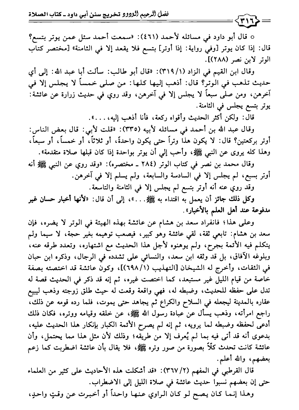 وقال ابن القيم في الزاد (١/ ٣١٩): "قال أبو طالب: سألت أبا عبد الله: إلى أي حديث تذهب في الوتر؟ قال: أذهب إليها كلها: من صلى خمساً لا يجلس إلا في آخرهن، ومن صلى سبعاً لا يجلس إلا في آخرهن، وقد روي في حديث زرارة عن عائشة: يوتر بتسع يجلس في الثامنة.