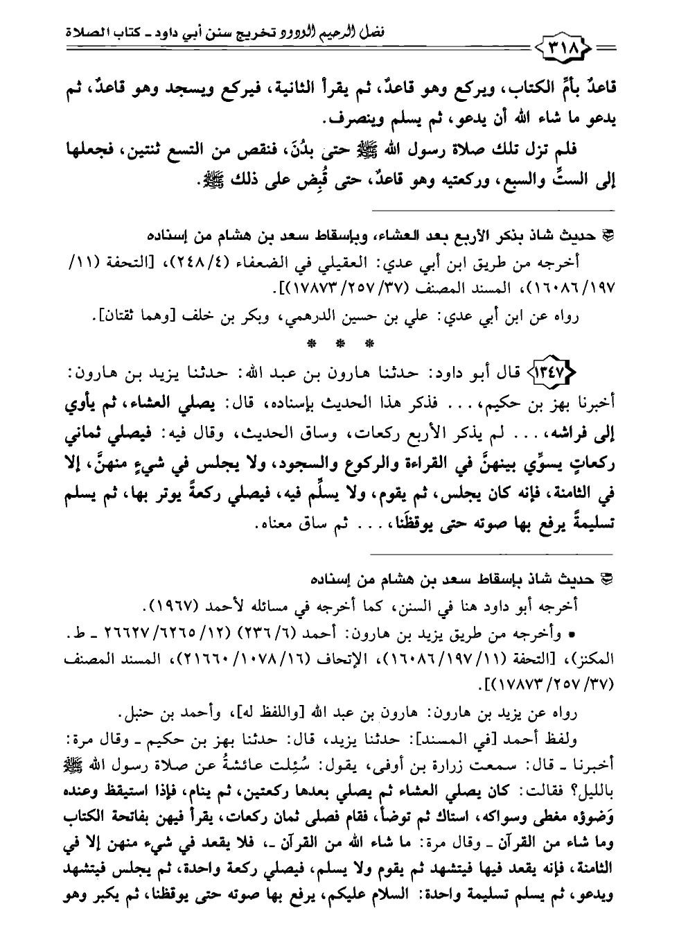١٣٤٧ - قال أبو داود: حدثنا هارون بن عبد الله: حدثنا يزيد بن هارون: أخبرنا بهز بن حكيم، ... فذكر هذا الحديث بإسناده، قال: يصلي العشاء، ثم يأوي إلى فراشه، ... لم يذكر الأربع ركعات، وساق الحديث، وقال فيه: فيصلي ثماني ركعاتٍ يسوِّي بينهنَّ في القراءة والركوع والسجود، ولا يجلس في شيءٍ منهنَّ، إلا في الثامنة، فإنه كان يجلس، ثم يقوم، ولا يسلِّم فيه، فيصلي ركعةً يوتر بها، ثم يسلم تسليمةً يرفع بها صوته حتى يوقظَنا، ... ثم ساق معناه.