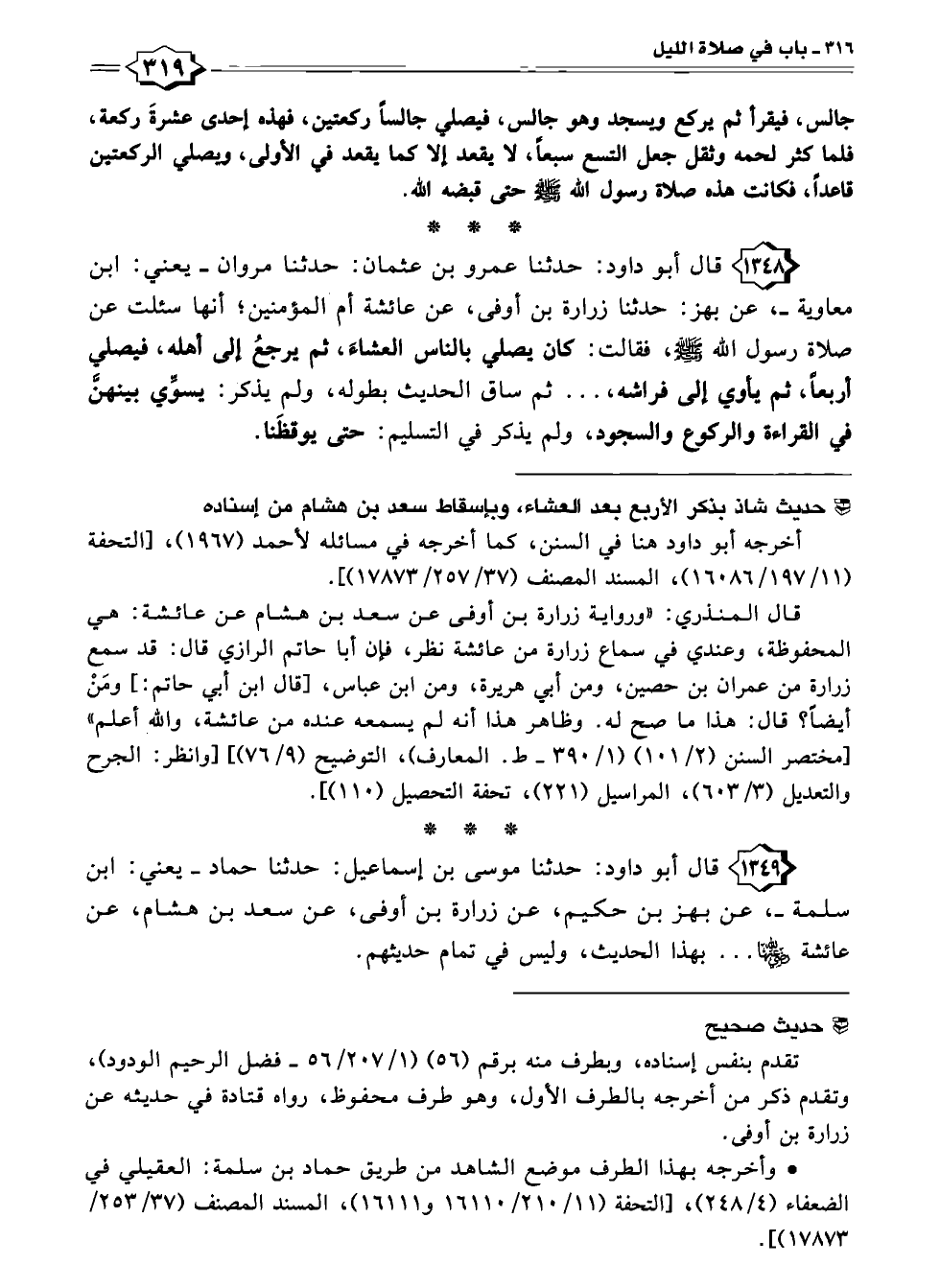 ١٣٤٨ - قال أبو داود: حدثنا عمرو بن عثمان: حدثنا مروان - يعني: ابن معاوية -، عن بهز: حدثنا زرارة بن أوفى، عن عائشة أم المؤمنين؛ أنها سئلت عن صلاة رسول الله - صلى الله عليه وسلم -، فقالت: كان يصلي بالناس العشاء ثم يرجعُ إلى أهله، فيصلي أربعاً، ثم يأوي إلى فراشه، ... ثم ساق الحديث بطوله، ولم يذكر: يسوِّي بينهنَّ في القراءة والركوع والسجود، ولم يذكر في التسليم: حتى يوقظَنا.