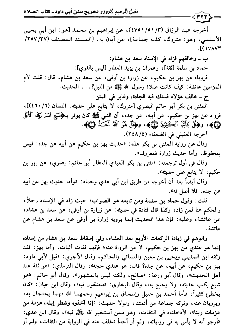 والوهم في زيادة الركعات الأربع بعد العشاء، وفي إسقاط سعد بن هشام من إسناده إنما هو عندي من بهز بن حكيم، لا من الرواة عنه؛ فإنهم ثقات أثبات، وأما بهز: فقد وثقه ابن المديني ويحيى بن معين والنسائي والحاكم، وقال الآجري: "قيل لأبي داود: بهز بن حكيم، عن أبيه، عن جده؟ قال: هو عندي حجة"، وقال الترمذي: "هو ثقة عند أهل الحديث"، وقال أبو زرعة: "صالح، ولكنه ليس بالمشهور"، وقال أبو حاتم: "هو شيخ يكتب حديثه، ولا يحتج به"، وقال البخاري: "يختلفون فيه"، وقال ابن حبان: "كان يخطئ كثيراً، فأما أحمد بن حنبل وإسحاق بن إبراهيم رحمهما الله فهما يحتجان به، ويرويان عنه، وتركه جماعة من أئمتنا، ولولا حديث: "إنا آخذوه وشطر إبله، عزمة من عزمات ربنا"، لأدخلناه في الثقات، وهو ممن أستخير الله عز وجل فيه"، وقال ابن عدي: "أرجو أنه لا بأس به في رواياته، ولم أر أحداً تخلف عنه في الرواية من الثقات، ولم أر