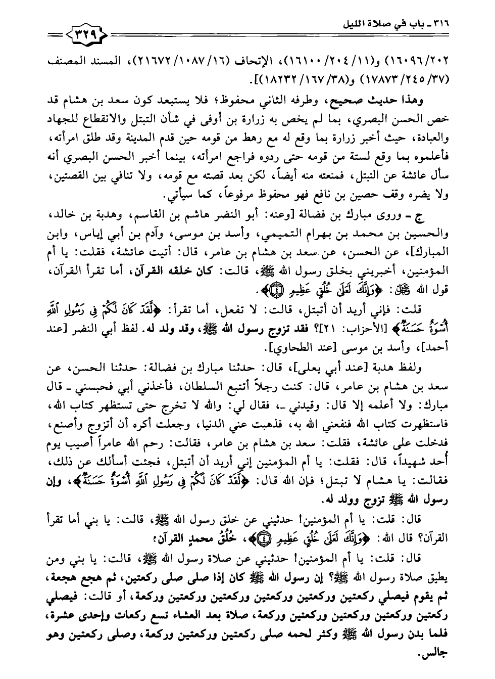 قال: قلت: يا أم المؤمنين! حدثيني عن صلاة رسول الله - صلى الله عليه وسلم -، قالت: يا بني ومن يطيق صلاة رسول الله - صلى الله عليه وسلم -؟ إن رسول الله - صلى الله عليه وسلم - كان إذاصلى صلى ركعتين، ثم هجع هجعة، ثم يقوم فيصلي ركعتين وركعتين وركعتين وركعتين وركعتين وركعة، أو قالت: فيصلي ركعتين وركعتين وركعتين وركعتين وركعة، صلاة بعد العشاء تسع ركعات وإحدى عشرة، فلما بدن رسول الله - صلى الله عليه وسلم - وكثر لحمه صلى ركعتين وركعتين وركعة، وصلى ركعتين وهو جالس.