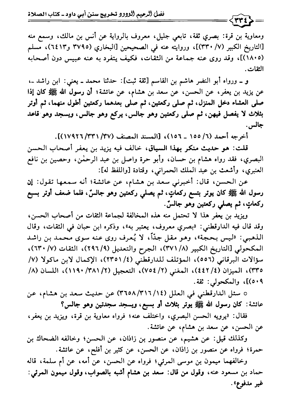 * سئل الدارقطني في العلل (١٤/ ٣١٦/ ٣٦٥٨) عن حديث سعد بن هشام، عن عائشة: كان رسول الله - صلى الله عليه وسلم - يوتر بثلاث أو بسبع، ويسجد سجدتين وهو جالس؟ فقال: "يرويه الحسن البصري، واختلف عنه؛ فرواه معاوية بن قرة، ويزيد بن يعفر، عن الحسن، عن سعد بن هشام، عن عائشة.