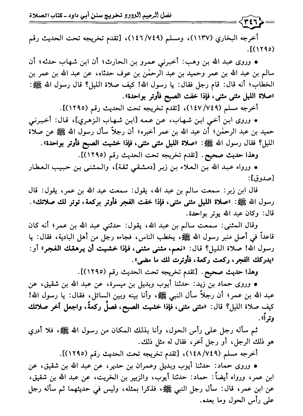 * وروى حماد بن زيد: حدثنا أيوب وبديل بن ميسرة، عن عبد الله بن شقيق، عن عبد الله بن عمر؛ أن رجلاً سأل النبي - صلى الله عليه وسلم -، وأنا بينه وبين السائل، فقال: يا رسول الله! كيف صلاة الليل؟ قال: "مثنى مثنى، فإذا خشيت الصبح، فصلِّ ركعةً، واجعل آخر صلاتك وتراً".
