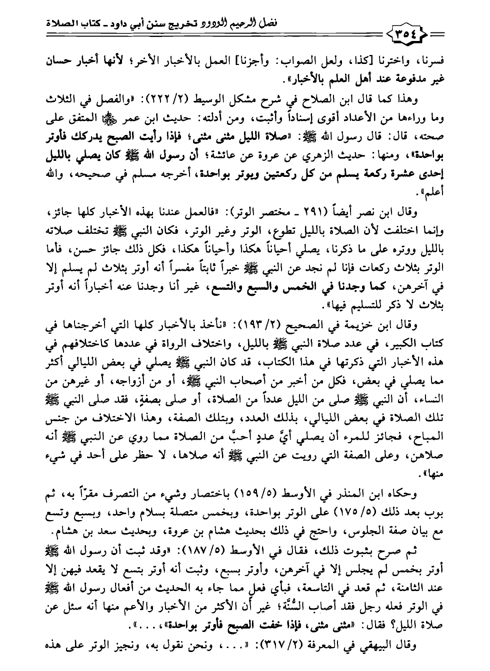 وقال ابن نصر أيضًا (٢٩١ - مختصر الوتر): "فالعمل عندنا بهذه الأخبار كلها جائز، وإنما اختلفت لأن الصلاة بالليل تطوع، الوتر وغير الوتر، فكان النبي -صلى الله عليه وسلم- تختلف صلاته بالليل ووتره على ما ذكرنا، يصلي أحيانًا هكذا وأحيانًا هكذا، فكل ذلك جائز حسن، فأما الوتر بثلاث ركعات فإنا لم نجد عن النبي -صلى الله عليه وسلم- خبرًا ثابتًا مفسرًا أنه أوتر بثلاث لم يسلم إلا في آخرهن، كما وجدنا في الخمس والسبع والتسع، غير أنا وجدنا عنه أخبارًا أنه أوتر بثلاث لا ذكر للتسليم فيها".